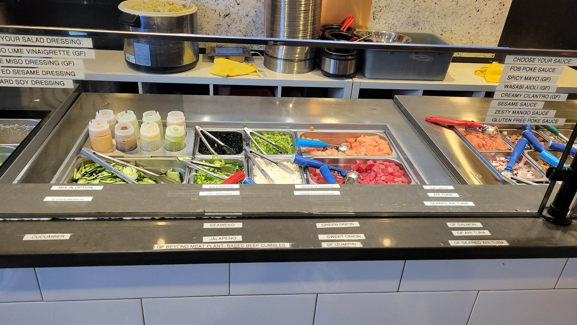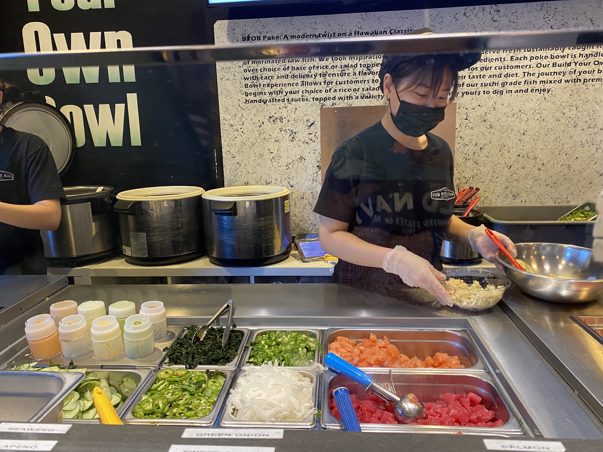 Update: after asking for a large bowl with my protein being tofu(which is what I always get) and not letting me know ..they proceeded to switch my bowl to small mid way through choosing toppings … moved me along toward the end to pay and once I realized at the end my bowl was now a small salad.. I went to the front to get it switched ….they refused to give me tofu in a large bowl with same toppings and kept saying it wasn’t a protein when it is … not sure why it couldn’t have just been poured into a large bowl with a little bit more toppings.. but when I got home it didn’t even have the small portion of tofu in it so I assume they couldn’t even hear me with masks and accent barrier even though I repeatedly said tofu throughout the process ..I’m gonna skip out on frustration and get poke elsewhere...