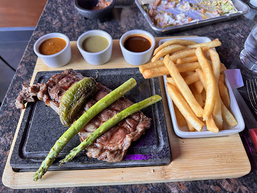 The Ribeye was served on a hot stone. We requested it medium, but were told that wasn’t an option. It arrived on the hot stone and, as expected, ended up overcooked and dry since it kept cooking on the plate. The dish was supposed to come with mashed potatoes, but they weren’t served until we asked for them, and again, they were presented in separate plates.