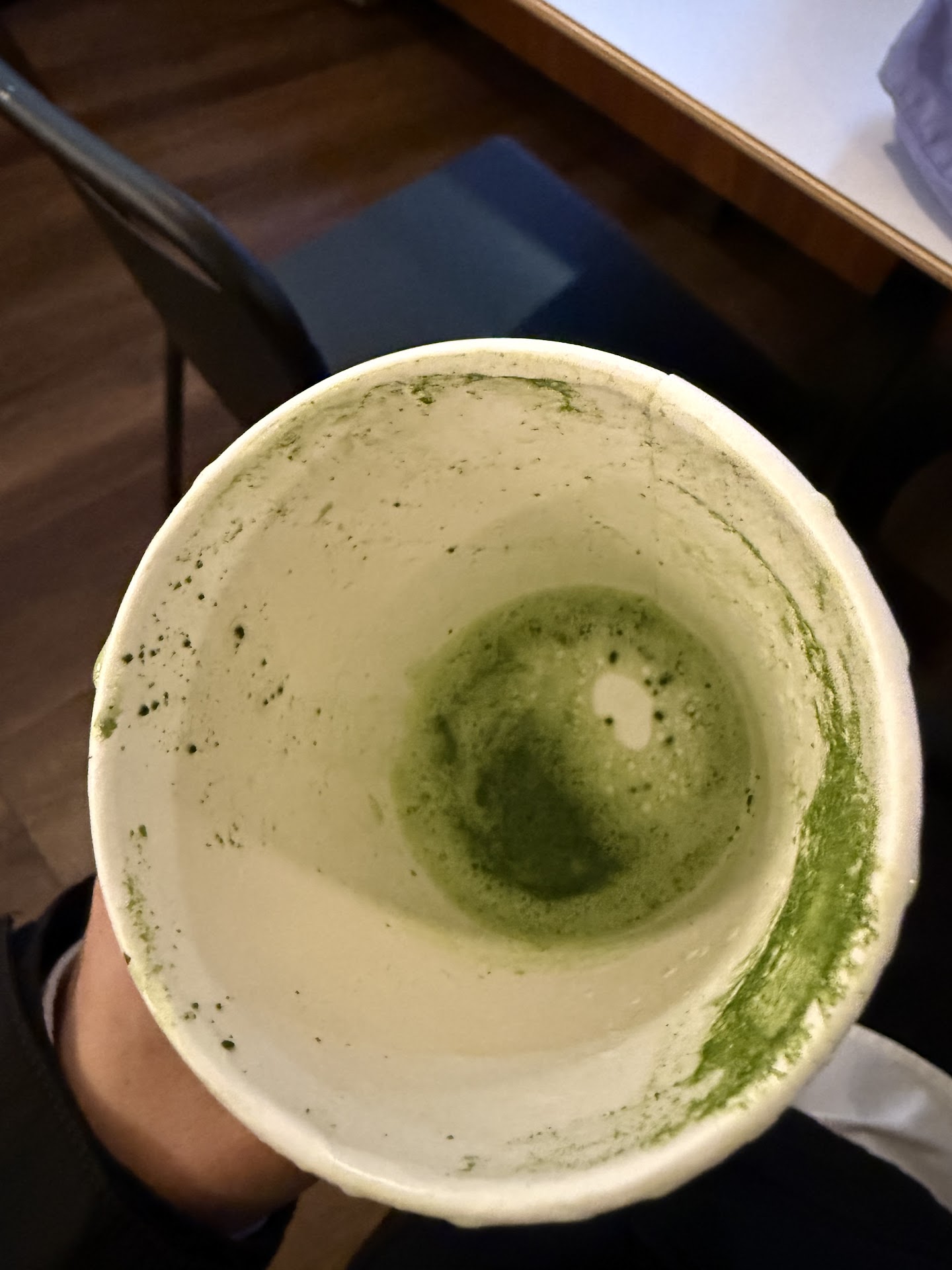 Chunky unblended matcha powder on the bottom of my cup. $6.50 for a small cup of lukewarm milk. The only good part was the first sip of foam.