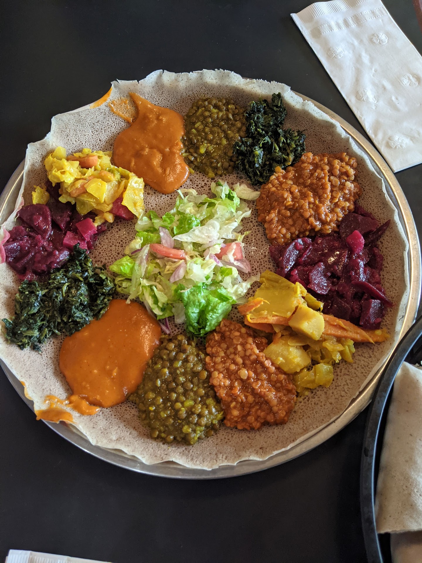 I had eaten here a few times pre-COVID for the amazing injera options, but just went back for you first time this weekend (Aug 2021) for a dine in experience. There are 2 tables outside and nicely spaced seating inside right by the door (which remained open for air flow the whole time). My friend and I ordered the deluxe/ultimate veggie option and it was the perfect amount for us if not a little bit too much. We also ordered a slice of the orange cake and it was perfectly fluffy and a good amount of sweet. In the past, I've done a veggie injera and a lamb ribs injera for 4-5 people - it's the best of both worlds!!