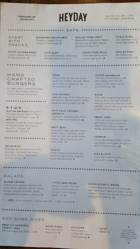 Read moreAtmosphere 4/5. Food 5/5. Service: 6/5. When you visit Heyday, expect to leave happy. Right from the get go, the first thing I noticed was the incredibly friendly servers. Like, what's going on here — is there something in the water — sort of friendly. Despite arriving at a busy dinner time by myself and taking up precious table space versus the bar, my server, Seiji, was probably the most authentically friendly and attentive server I've ever had. I ordered the Bacon Bleu burger with tots. The burger arrived with ambozola triple cream bleu cheese, in-house made "bacon jam" and secret sauce. The burger wasn't huge, but combined with the giant bowl of hot and delightfully crispy tator tots, I left stuffed and satisfied. Yes, the experience wasn't cheap, but you get what you pay for in terms of a very well made burger and especially exceptional service! Heyday is a hidden gem and I will most...
