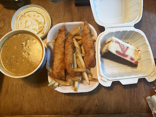 The fish was delicious, the fries didn't taste very fresh, the calamari was completely grease soaked, and the chower was just okay. Out of the 3 cups of chowder ordered, 1 of them was extremely watery (like it was skimmed off the top of the pot).