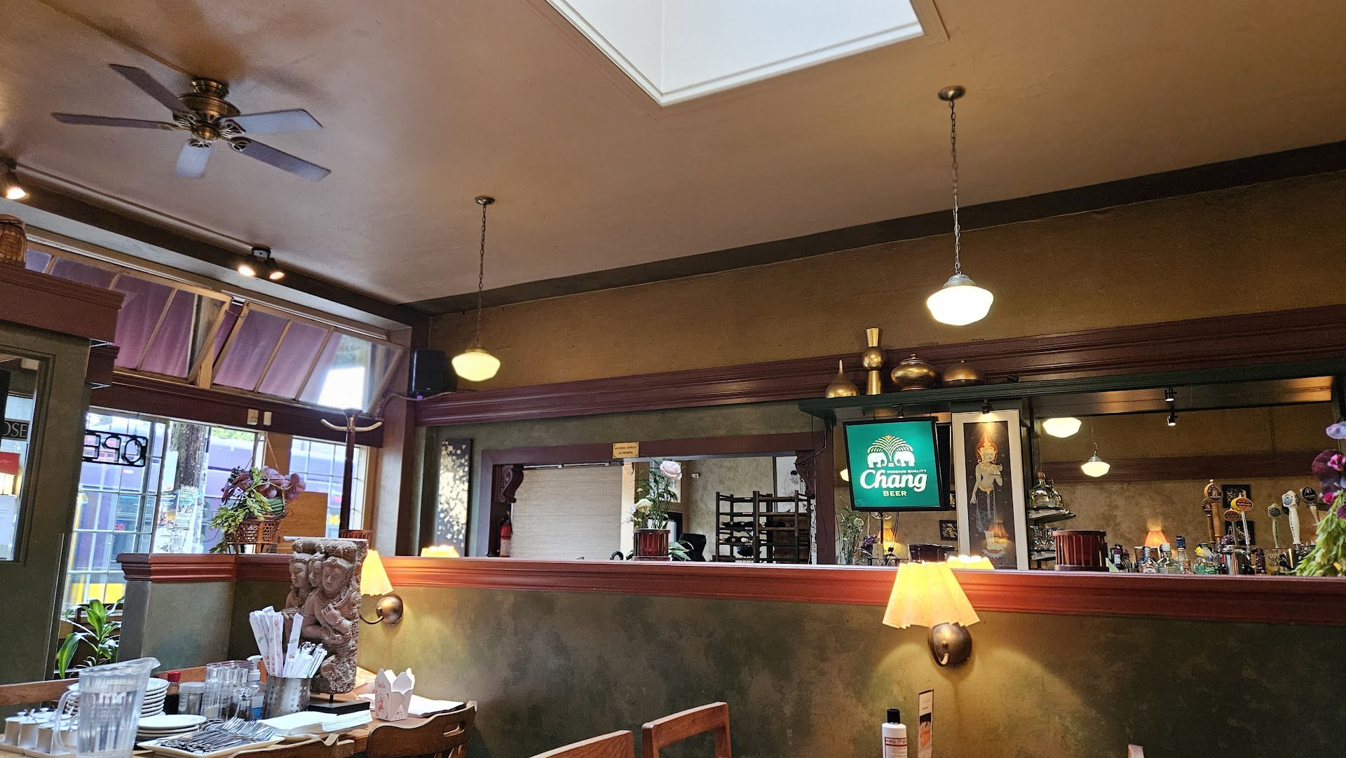 Come here for the atmosphere. This place has tons of potential, but they are missing some important elements. You can tell a lot by ordering the tea! Ordered the Pad Gra Pow chicken with brown rice, Angel Asparagus, Calamari, Tom Ka soup, & Jasmine Tea. The tea came out in a nice ornate, albeit tiny iron pot really meant for a single serving. It also came warm & not really hot at all. And that really explains this place -- looks good, but nothing that stands out. Everything that came out would miss a little detail-- tea, was pretty but came out luke warm & bitter; Calamari came out crispy but it tasted like dry chicken nuggets; Pad Gra Pow, egg & brown rice was dry; Angel Asparagus, tasted great but the color was flat & the food luke warm. So the service had the same misses. The waitress was very sweet, remembered to remove the bell pepperd as asked but forgot that we asked for chopsticks. As the food came out without chopsticks, I ended up having to snag a to-go set on my own. They gave us cheap, clear plastic, dollar-store to-go container with a plain paper bag. Did they want us to tip AND work? "Missing the attention to detail" is my impression of this restaurant. Just check the menu & look for "say sauce" and "prok (*pork)" -- you won't be able to unsee it.