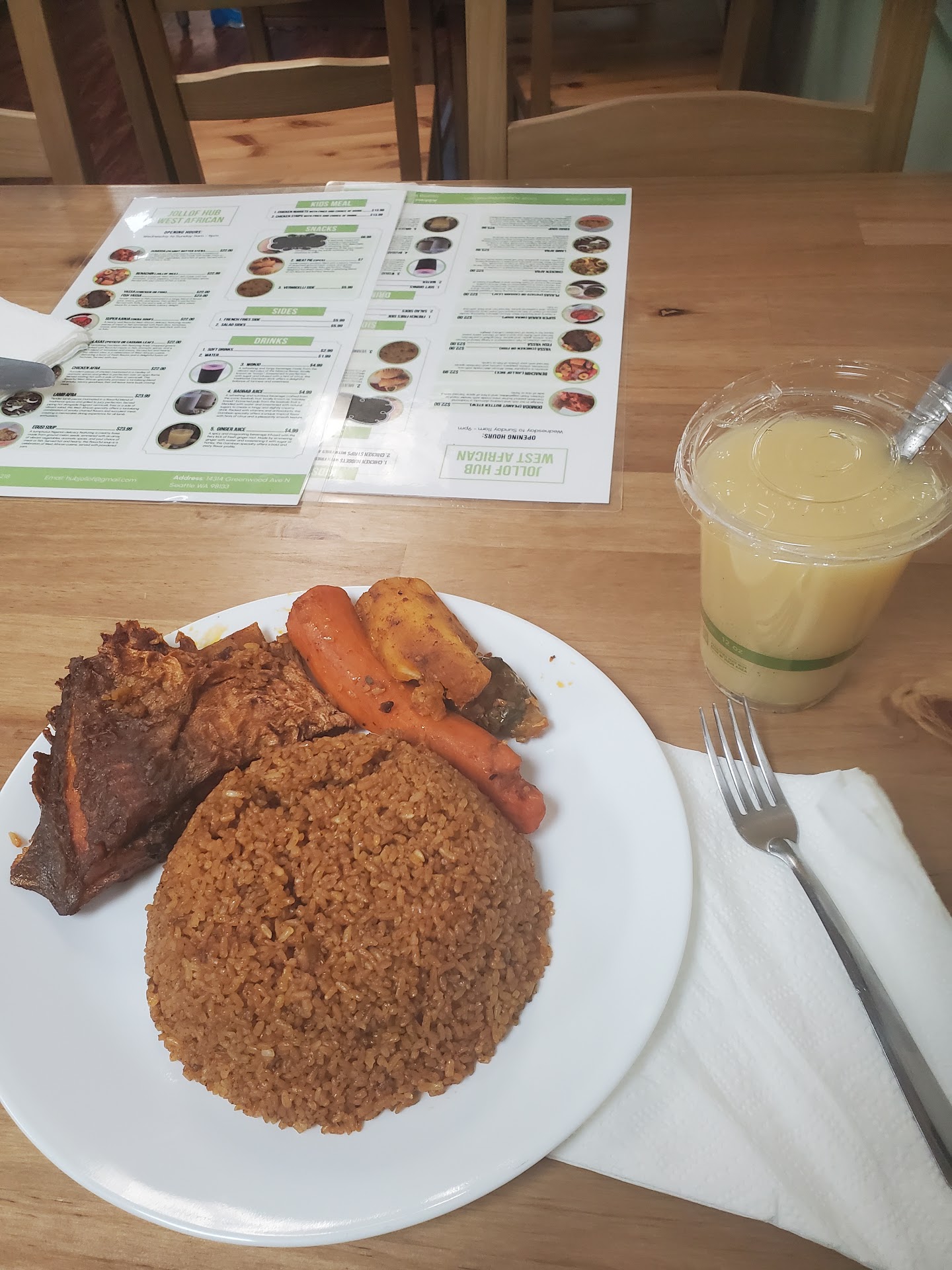 Read more10/10 best place in Seattle for western African dishes, ESPECIALLY the BENACHIN (jollof rice) ohhh myyy gosh the vegetables were cooked to perfection and that lamb was so tender. It fell right off the bone with the seasoning is perfect.I also odered SUPER KANJA (okra soup) & EGUSI soup was to die for!!! Not exaggerating at all!! I tried both wonjo & baobab juice aswell and it was sooooo deliciousssssss!!!!!! I cannot recommend this place enough!! I will be returning for more. oh, and I cannot forget the plantains ABSOLUTELY THE BEST PLANTAINS I HAVE EVER HAD IN MY LIFE. and don’t get me started on the service. It was absolutely outstanding. He was very sweet and Informative...