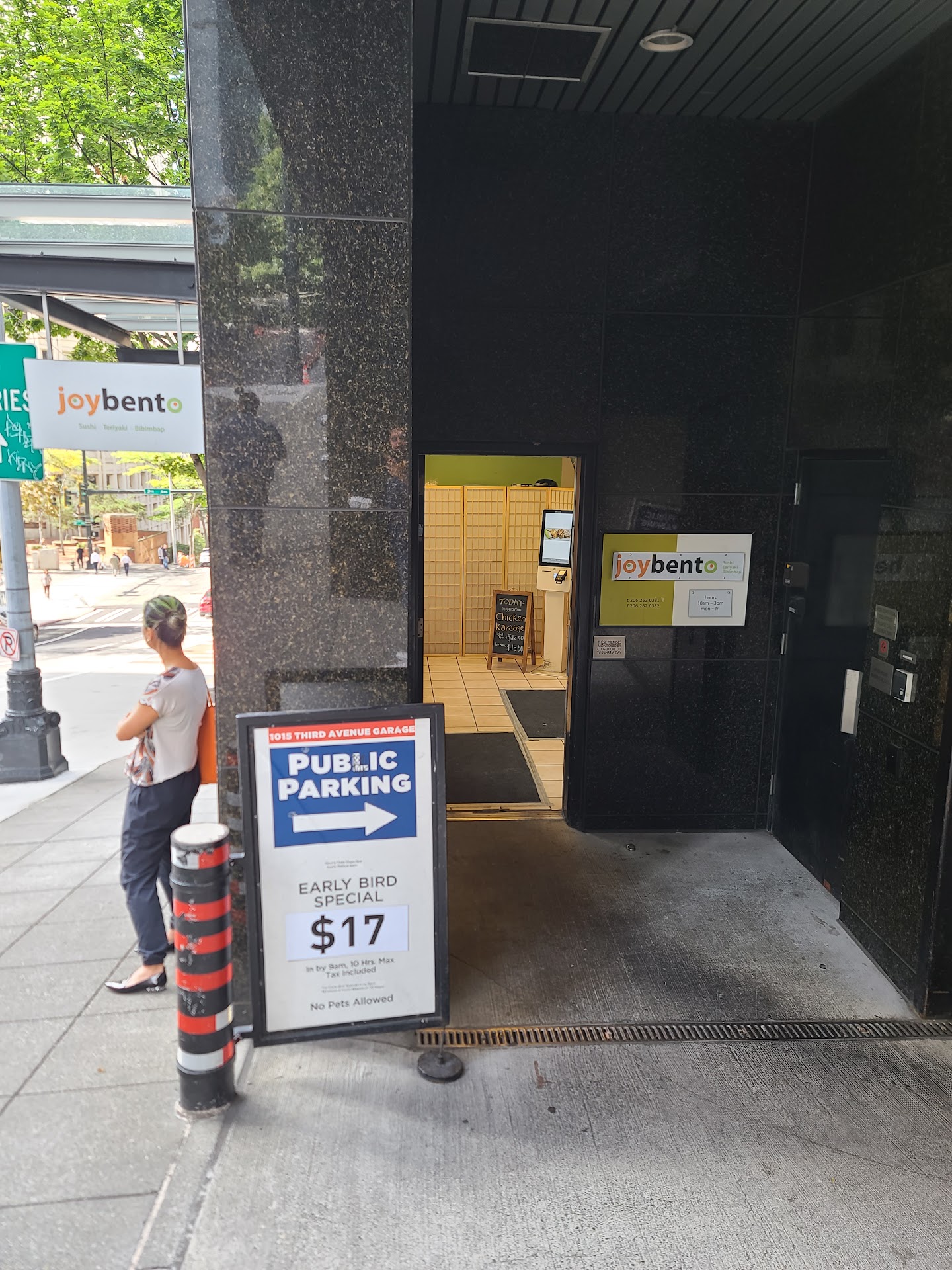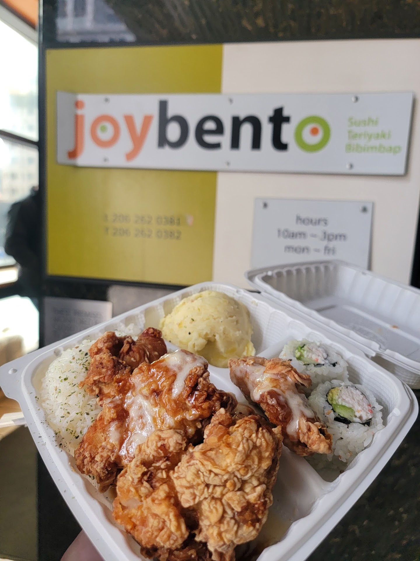joybento is a small kitchen serving sushi, teriyaki and poke. It's located inside of a parking garage right off the street between 2nd and 3rd. It's got no seating inside so it's only to go. They make everything right as you order and have 3-5 people working in the tiny kitchen to get food to you fast. Their menu has a decent amount of items on it, and although it's slightly on the higher side in price, the portion sizes are good and taste is phenomenal. Their Inari is pretty plump and flavorful, bento boxes are heavy, gyoza is a mix of soft and crunchy, and their rolls are fresh. Their service is great too, very friendly and super quick. Definitely a top lunch spot if you're in the downtown area, but get there before it gets packed...