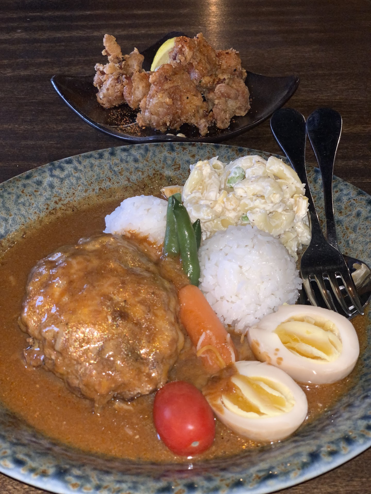 To start, we had a small order of chicken karaage, which was perfect. It’s hard to find a good chicken karaage nowadays - they’re either too salty or too dry from re-frying, but not here. You could really tell it was made fresh. For my entree, I went with the loco moco (house original meatball patty with brown gravy sauce, served with rice, seasoned soft boiled egg and macaroni salad). I of course added cheese for an extra $1. The gravy was really good - I ended up dipping some of the chicken karaage in it. The patty was larger than most loco mocos I’ve had but I ate it all. The Mac salad was unique - in a good way. It’s not overly mayo-naissy like 90% of the Mac salads you’d find in Hawaii. But this one was nice and light. Plus the corn in it was a nice touch. This loco moco was better than ones I’ve had in Hawaii. I might even say it’s the best loco moco I’ve ever had! Fiancé had the Deluxe Curry (Curry rice with Chicken Karaage, Hamburger patty, soft boiled egg and vegetables). I thought the curry was good but not as good as my loco moco sauce.