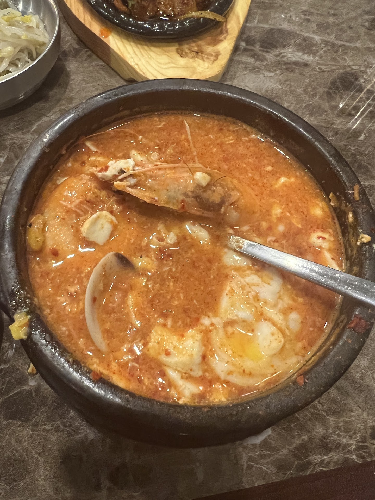 Our main dishes were bland and extremely spicy when we ordered one mild. Pork was full of fat parts with ton of oil and barely any flavor (at least it wasn’t smelly). I was surprised to discover that there were 2 shrimp and exactly 1 clam for both of our tofu soup. I couldn’t really understand why they did so? It lacked the seafood flavor in the broth and barely any seafood to be eaten. Plus, the combo was $23 with tax.