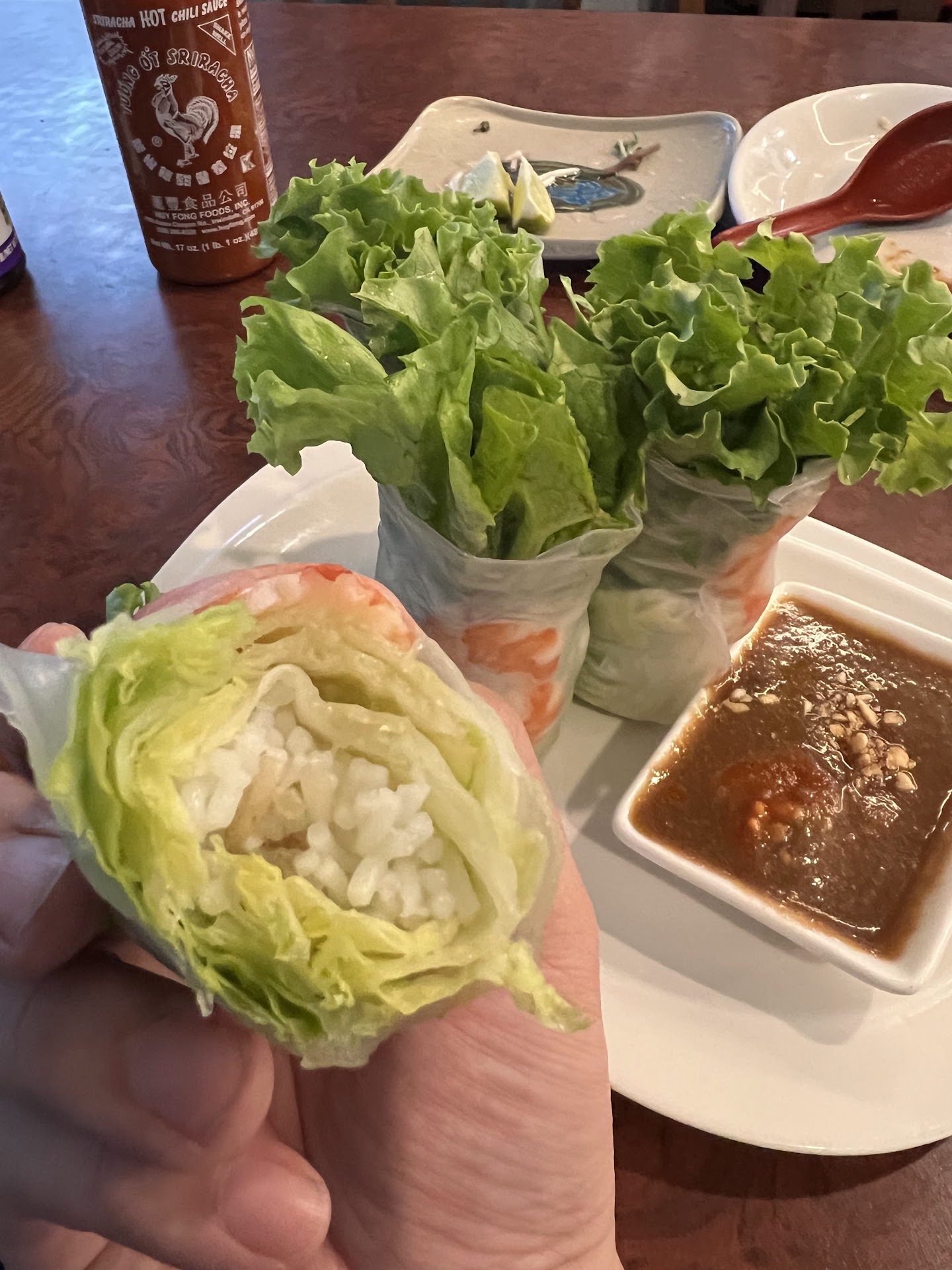The fresh rolls were disappointing, each containing just 1 shrimp, vermicelli noodles, and Romaine lettuce, with barely a hint of mint. The peanut sauce, a crucial component, ran out before I could finish the rolls, leaving the remaining bites dry and unappetizing.