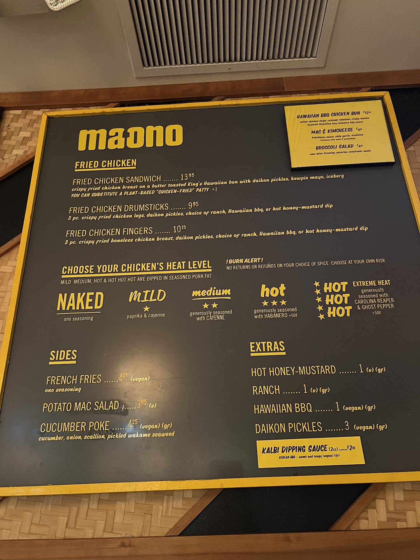 Read moreMy first time having Hawaiian fried chicken and turns out it's pretty good! I wound up ordering a medium spiciness chicken sandwich, some fries (and because I hadn't eaten all day), some of their kimchi mac 'n' cheese. But before I even get to the food itself, the pricing was surprisingly reasonable for a restaurant operating in the University Village. Some of the places in here charge pretty high prices for what's on offer, so getting good food like this with fairly generous portion sizes is great. Rarely do I come away from a meal at the Village with so little spent AND food leftover.