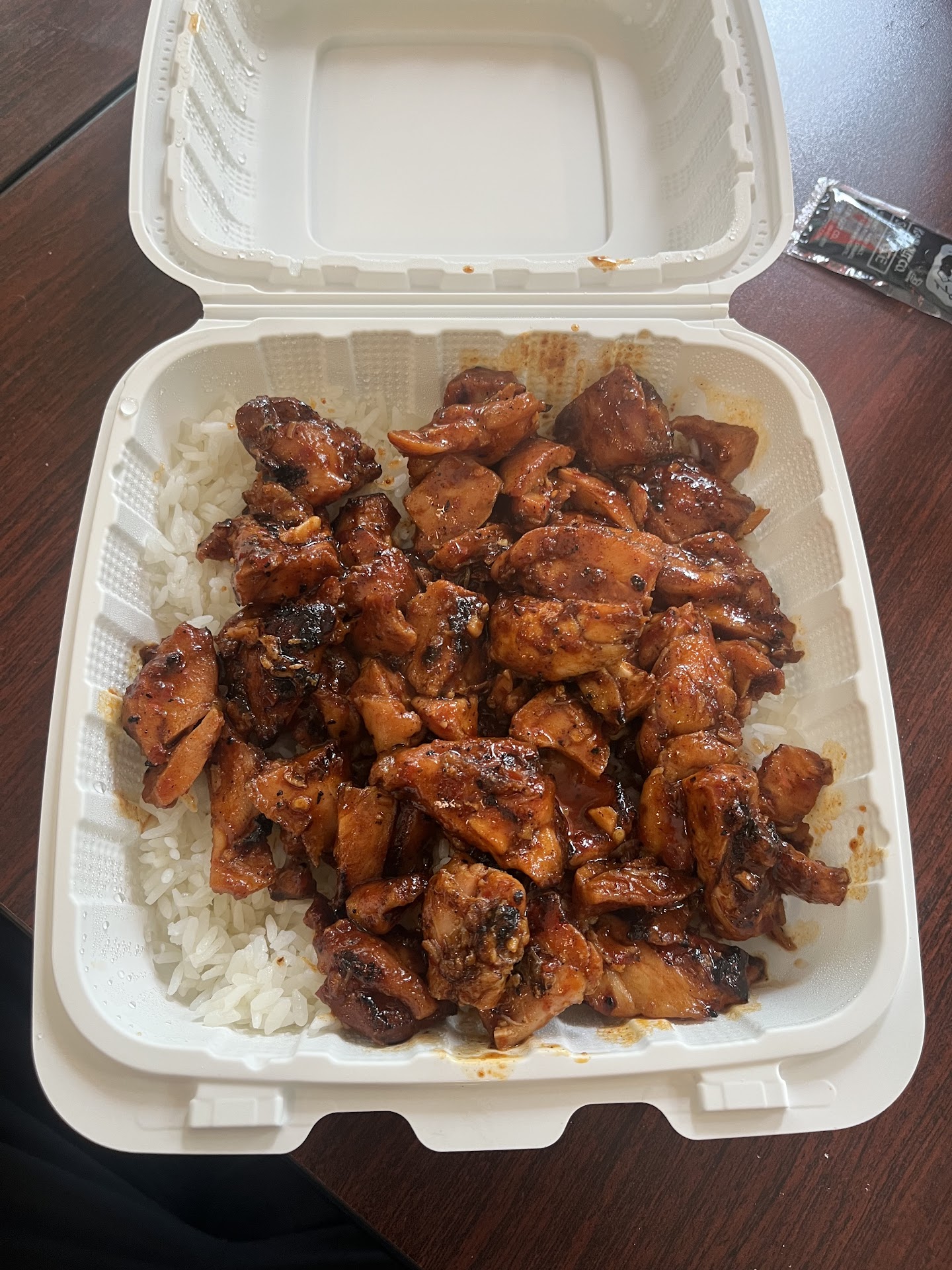 I had the namesake chicken teriyaki from this place. Unlike some other places, it doesn't give you a side salad by default, so it was just the grilled chicken thighs over rice