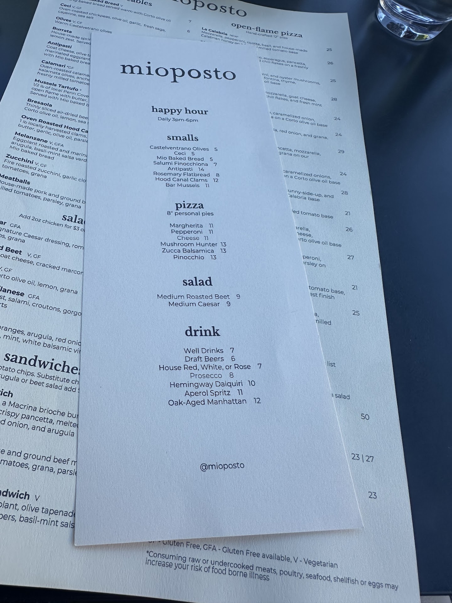 My experience at Mioposto was fantastic overall! I came during happy hour (About 5:30 pm). Our server, Claire, did an outstanding job balancing being both friendly and efficient. The staff here worked cohesively. The manager was present on the floor and every employee who walked by me while I was waiting greeted me.