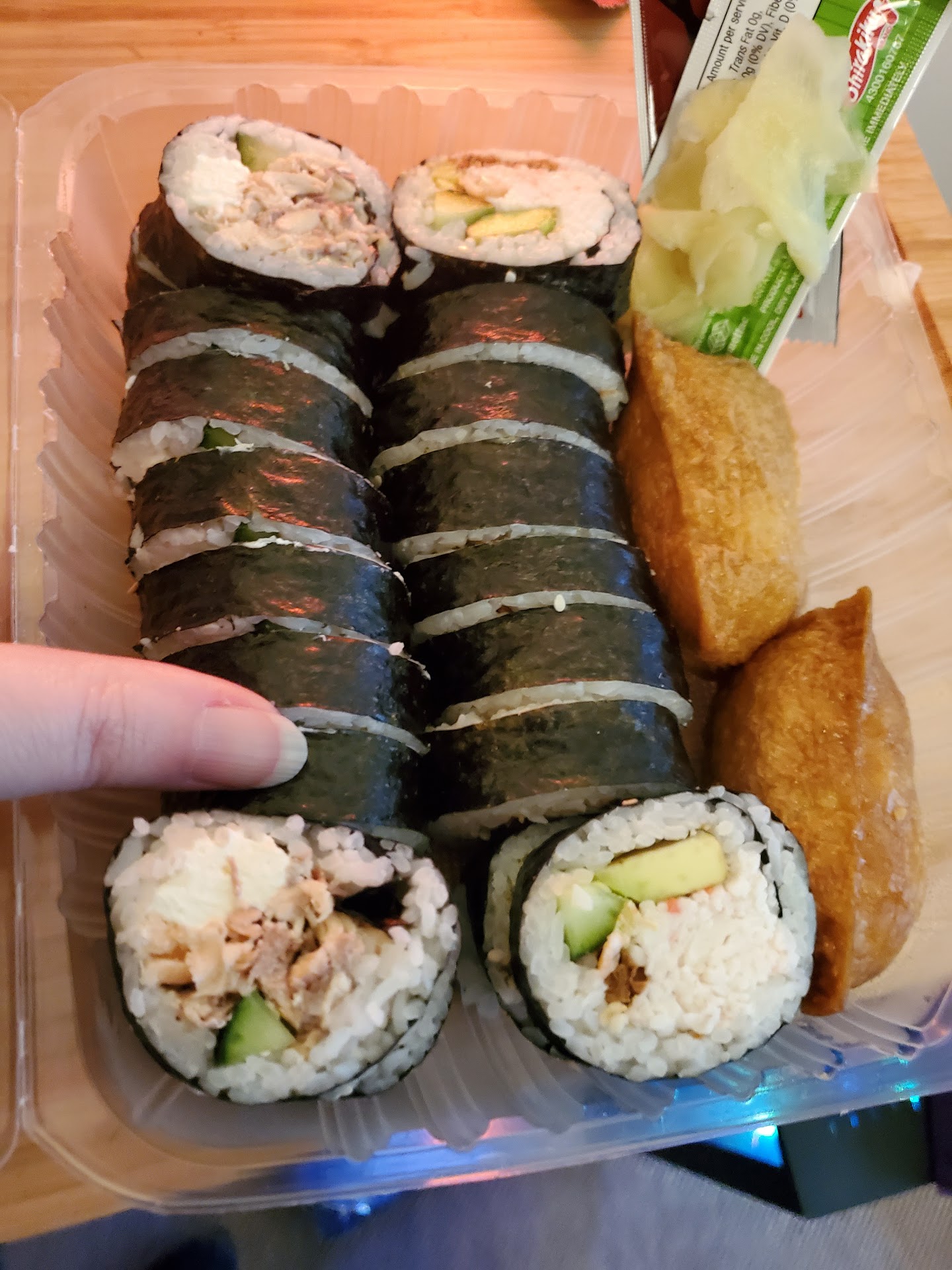 I got two inari sushi, a Cali roll and the smoked salmon and cream cheese roll. At first I was kind of bummed to see these weren't inside out rolls (just a personal preference, I like my rice on the outside, no big deal though), but the salmon that was supposed to be smoked salmon tasted just like really dry, normal salmon. The crab salad was also pretty dry in the Cali roll as well. The rice used isn't really seasoned either so the flavors felt really bland and smelled noticeably vinegary.