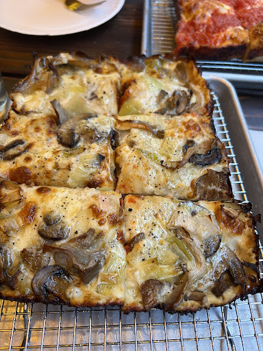 My one issue with the pizza is the corner pieces. The edges are charred a bit too much - to the point where they're basically black. This makes them super chewy to eat, and I did not enjoy when I got to the crust on these pieces. The best part of a Detroit-style pizza should be the crust on the outer edges, but this part was way overcooked for me. Also the edges had a ton of oil