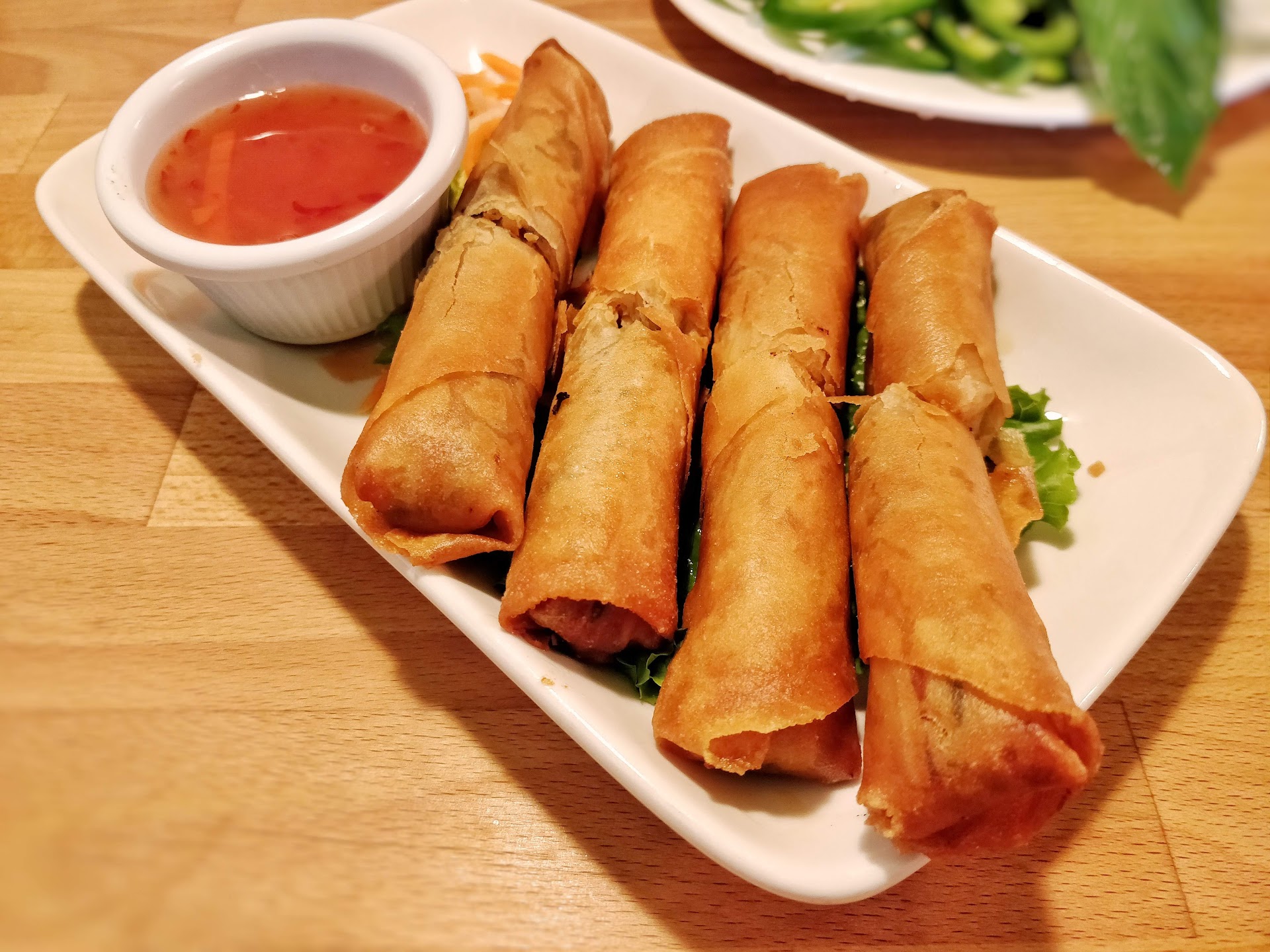 The "egg rolls" (crispy spring rolls) are extremely delicious; perfectly fried to an ideal crispiness in clean oil and served with Mae Ploy Sweet Chili Sauce.