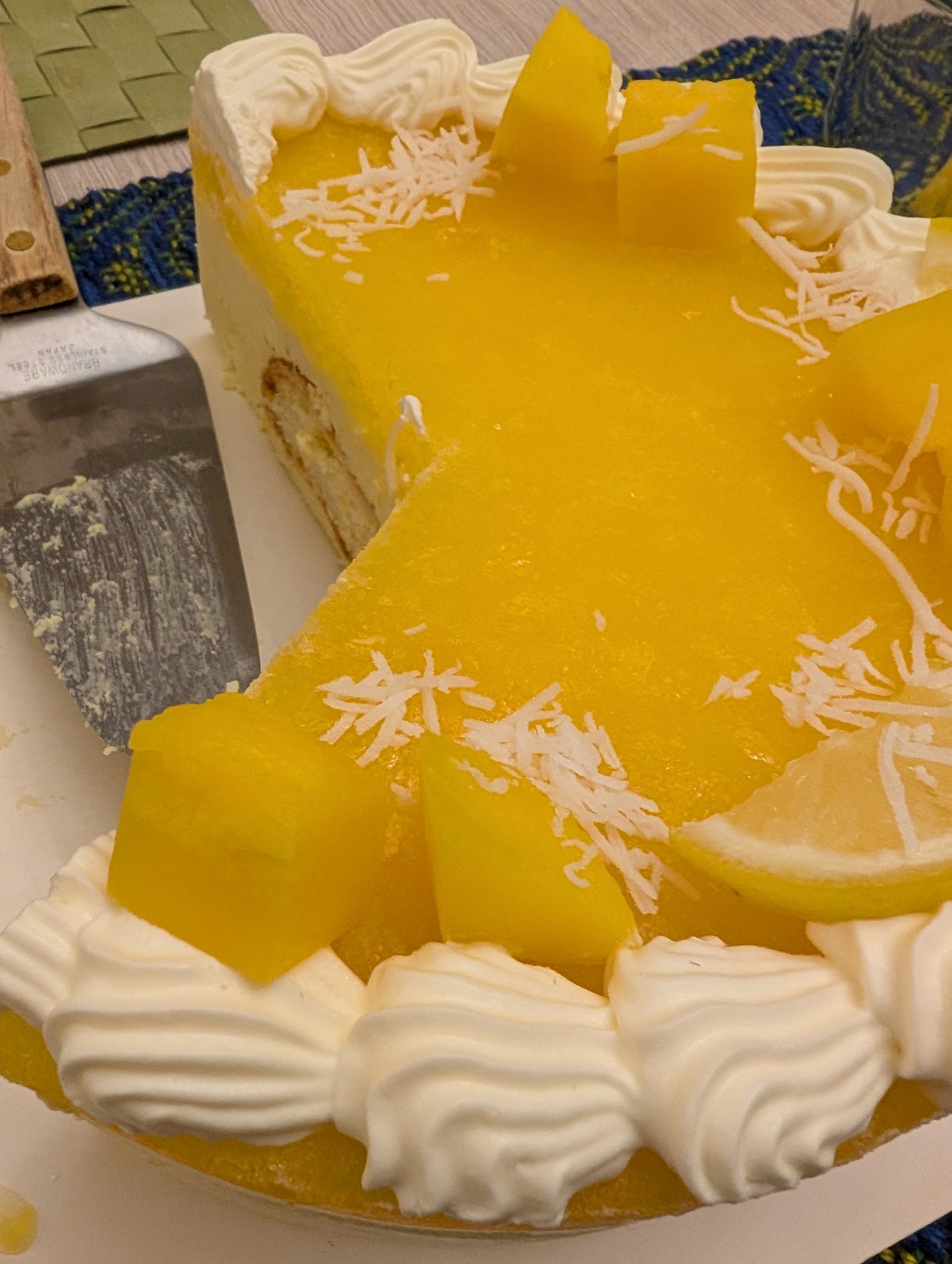 Finally, the cake itself just wasn't very good. For some reason, it contained little chewy boba-like bits that gave the whole thing a weird texture, and the "mousse" part wasn't that soft or airy. That, combined with the frozen top and the sad mango pieces, made our entire family grimace while eating.
