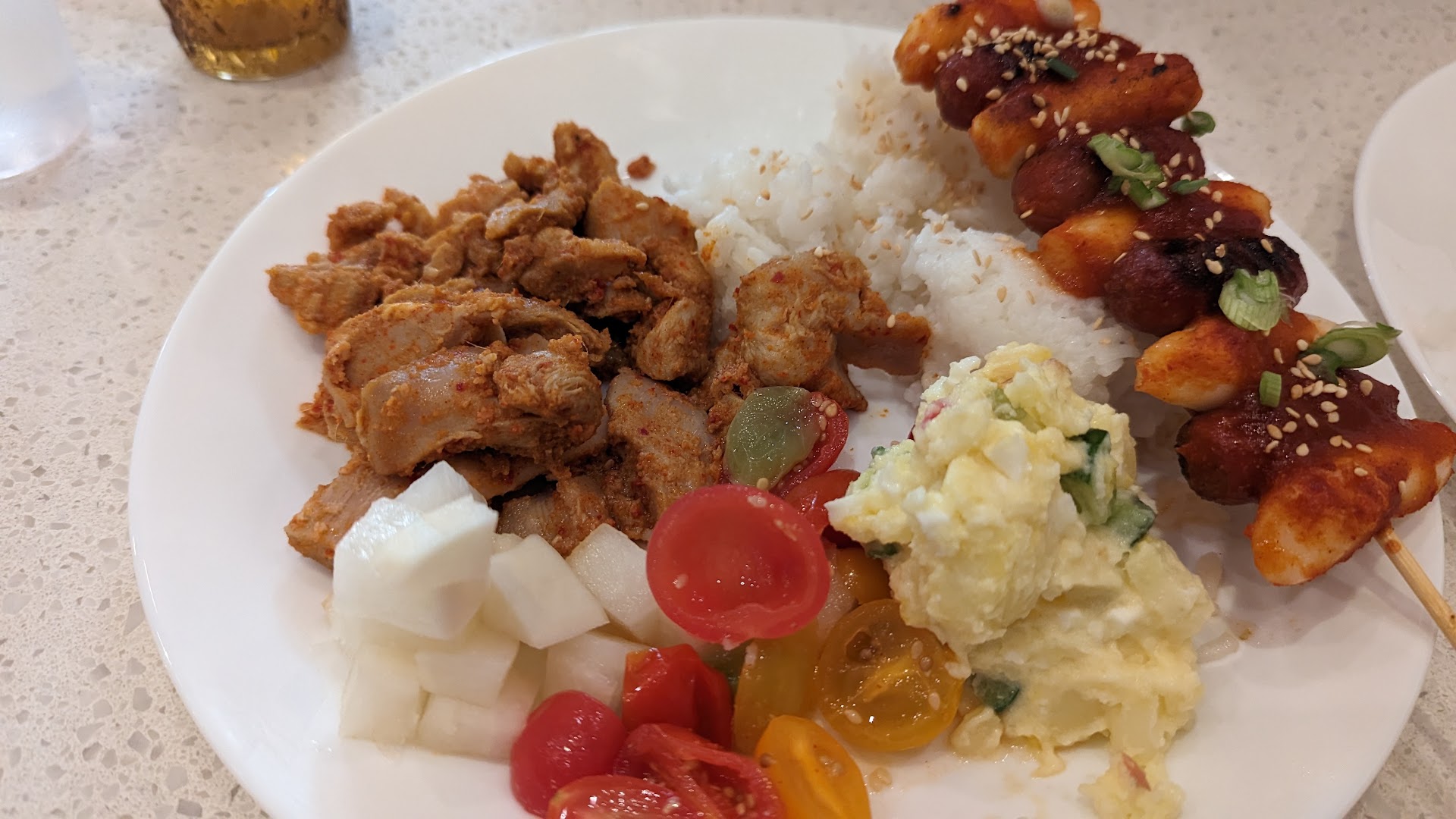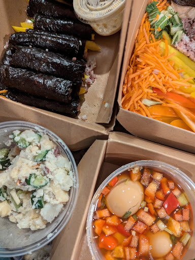 Banchan plate - picked chicken with tomato, radish, and potato salad sides. To me, the chicken lacked flavor. It was salty without much else going on - would have liked it to be spicier or sweeter, or something. It also didn't have any crispiness or charring that I'd expect from something that's been stir fried. The radishes were overly vinegar-y for my preference. The tomatoes didn't have much seasoning - just tasted like cherry tomatoes with vinegar. Potato salad was pretty good, though. However, the most disappointing part to me was how mushy the rice was. It did not taste/feel fresh at all.