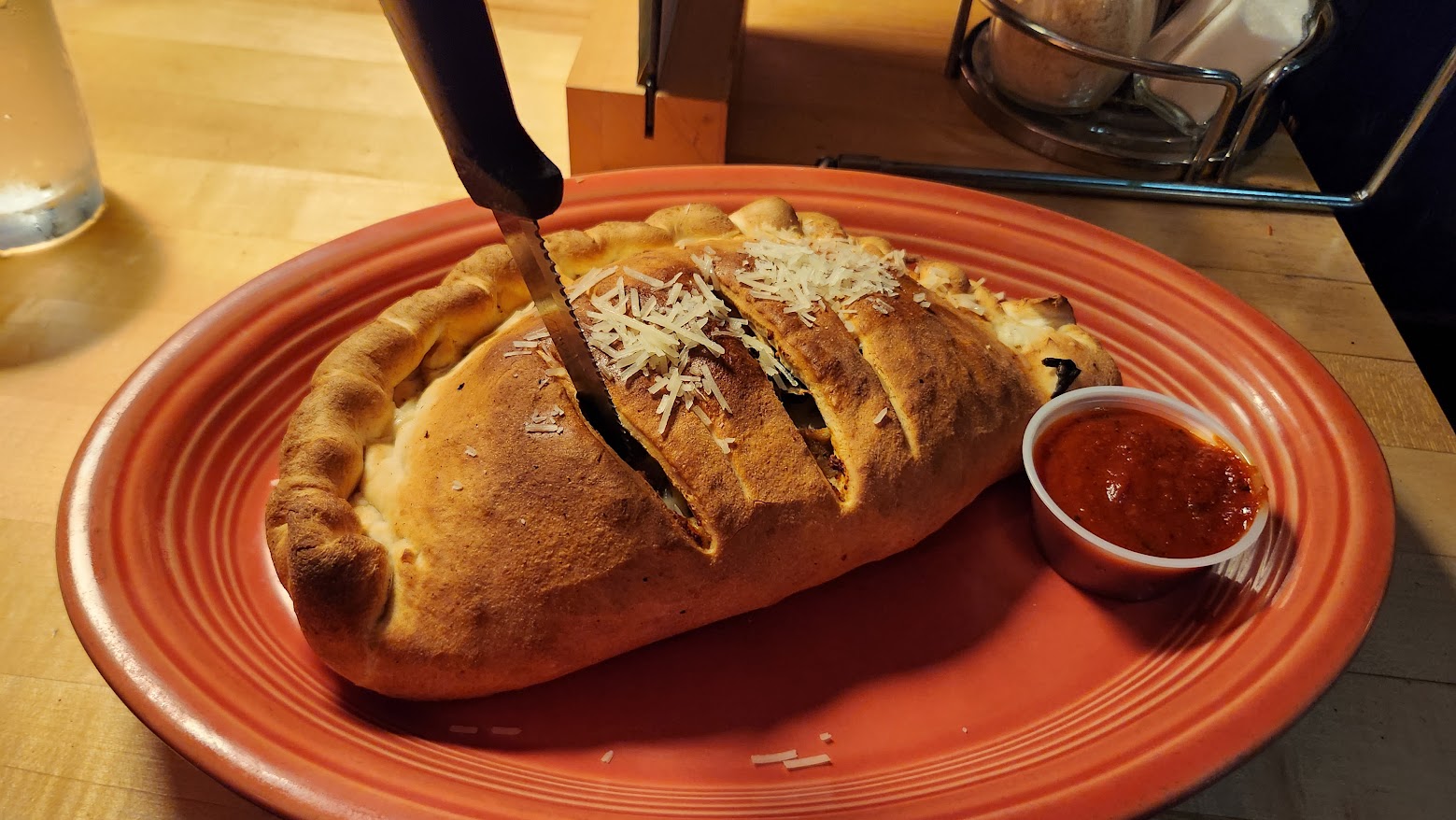 As I wanted Americanized Italian dishes when decided to come here, I ordered a baked spaghetti and it was super delicious in its own kind. Look at my video! Chicken breast in Calzone was plump and soft — another surprise. It is SO hard to prevent chicken breast from being dry, chewy, or brined too much. They did really great job!