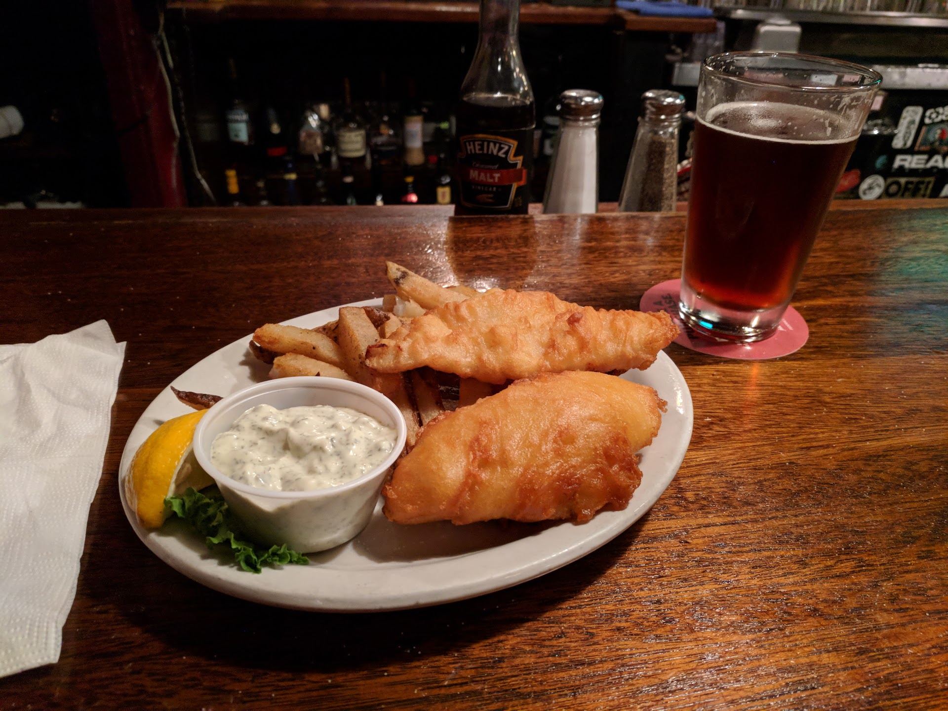 If you've read this far, you probably want to know about the food. Let's start with the good: The fish was nice. The batter was the perfect thickness. The fish was the right amount of flake, but I still needed a fork. The tartar sauce was also pretty good, but I'm not a connoisseur; I prefer lemon. The ale (Ridgetop Red) was one of the best ambers I've had. The fries were the disappointment. The cut and flavor was nice, but super soggy and soft. I expected more from them. The food I ordered wasn't cheap (I'd call it average pricing for pub food).