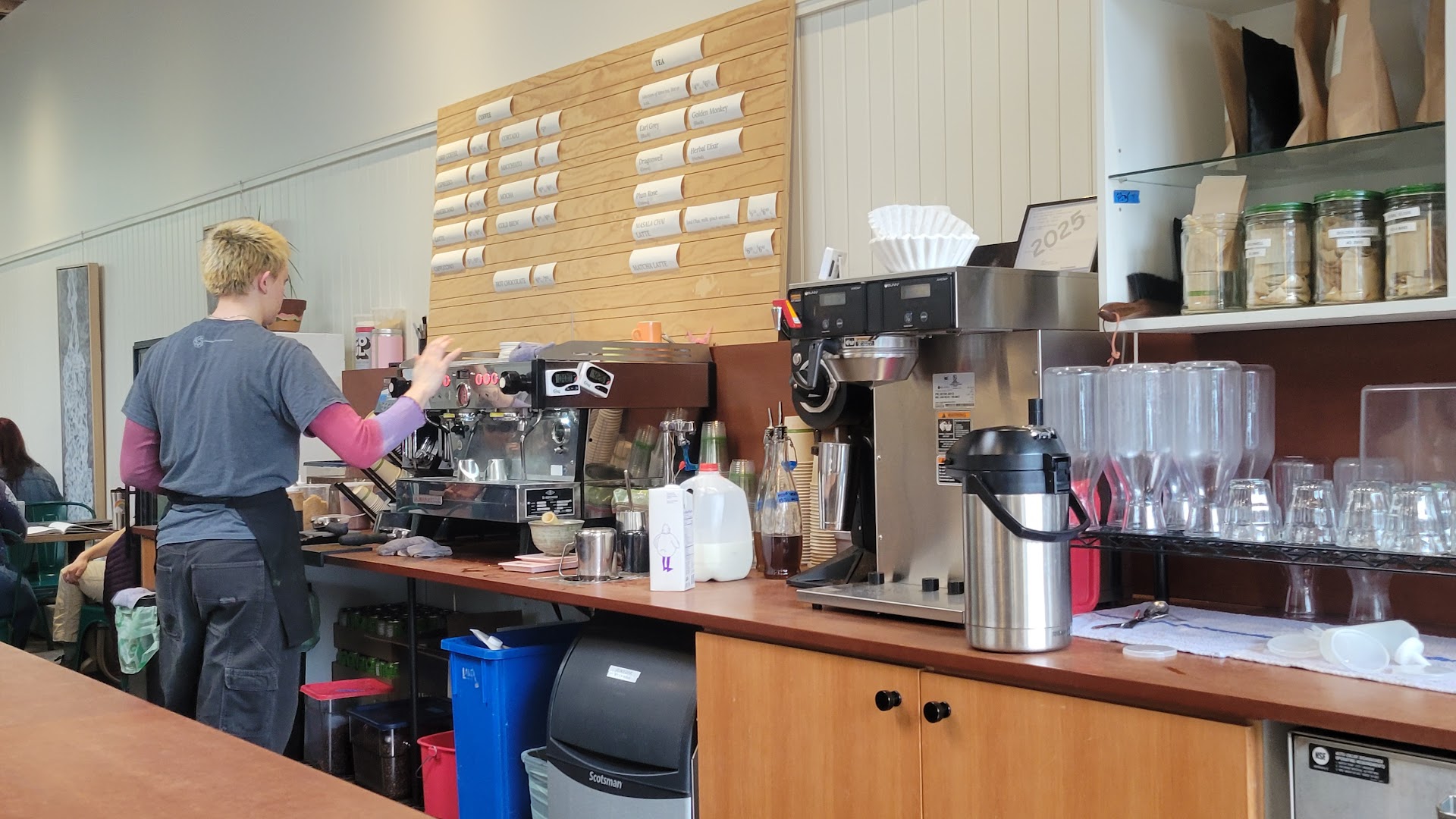 Polished concrete flooring, fairly sparse amenities. At least we aren't paying for an expensive interior. A rough dozen 4 tops, metal chairs, and a long shared table near the espresso station with a few at a counter by the other front window.