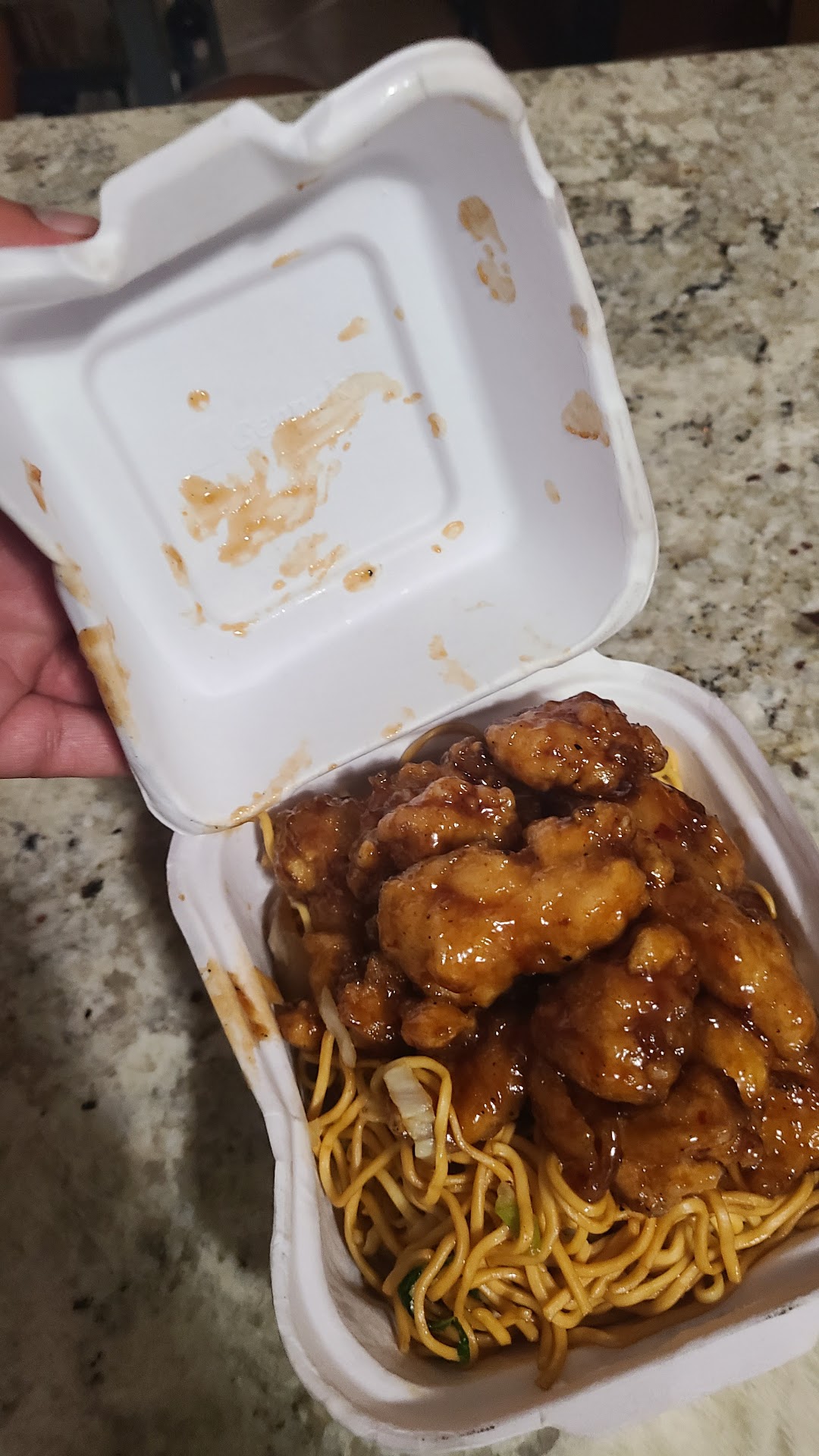 The food looks lukewarm and gross. It looks they just barely cooked the meat and then slathered it in sauce to make it seem appealing. The chow mein in particular is really slimy and bland. The honey walnut shrimp had the coating peeling off the meat before I even started eating it (and yet they charge extra for that entree…?).