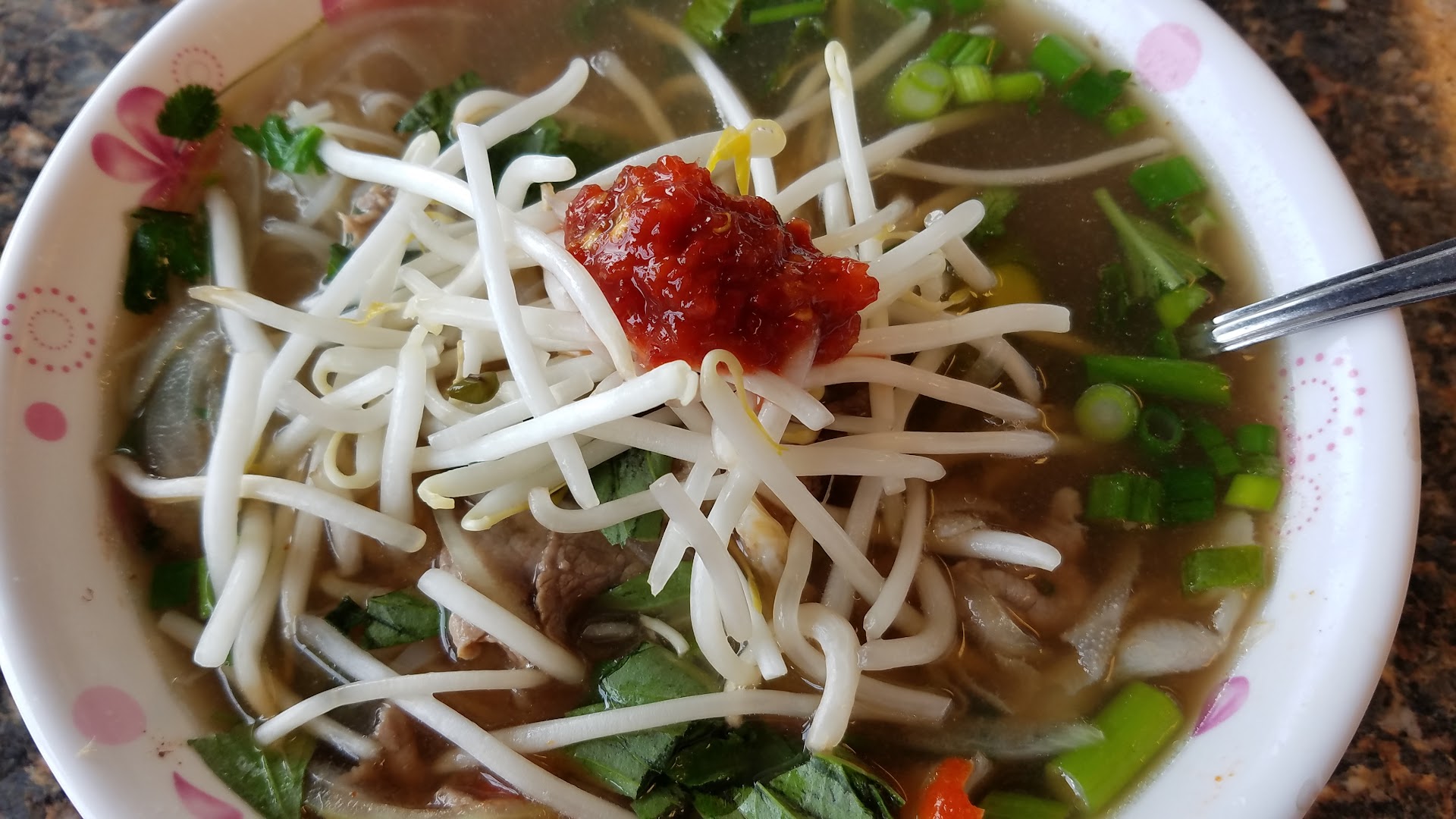 With it being the only Pho place open at 9 a.m., my choices were limited. With that being said, the soup itself was good. However, the vegetables they served with it was questionable. I ordered fried spring rolls and ask for lettuce on the side, and why did she bring me wilted soggy lettuce? THEN something was floating in my water, so I asked for a whole new cup and she brought back a pitcher of water to fill my cup up , so I told her no thanks I want a new cup she said ice? I said yes, so she brought me a cup of ice and I said can I get some water? She said yes and she brought me a cup of water lol. So I poured the cup of water into my cup of ice lol. It was a communication barrier; most definitely. THEN there was a fly trap right above my head in the corner, and the walls are really f** dirty. BUT OTHER THAN THAT I WILL...