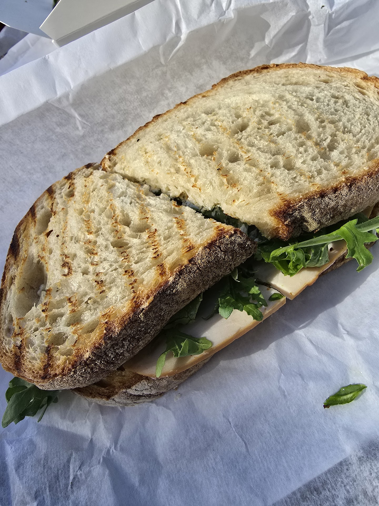 Now for the other two items. The turkey sandwich was nice. It definitely had nice thick pieces of Turkey, the bread was made fresh, and, the Panini press really gave it that nice chart. For me I would have liked a bit more of the herb spread because you could really taste the fresh herbs.