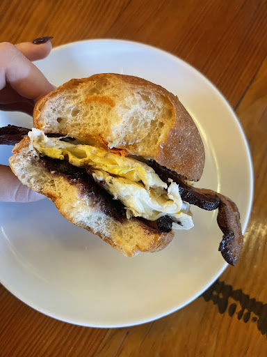 Ordered our usual oat milk lattes (yum!). They use Hidden Figures for their oat milk, just FYI. My mission is to try every breakfast sandwich in Seattle, so naturally we tried the Egg Sandwich. This was one of the most unique flavor combinations I've ever tried! Fried egg, Beecher's cheddar cheese, Fresno chilies for a little kick, finished with blueberry preserves for a hint of sweetness! Definitely add the bacon. YUM x 2. No shock here since B&H's kitchen is top notch. The only opportunity this place has is to check on the food more regularly - our sandwich took over 30 minutes! One other note - this place can be pretty pricey. Two lattes and two breakfast sandwiches...