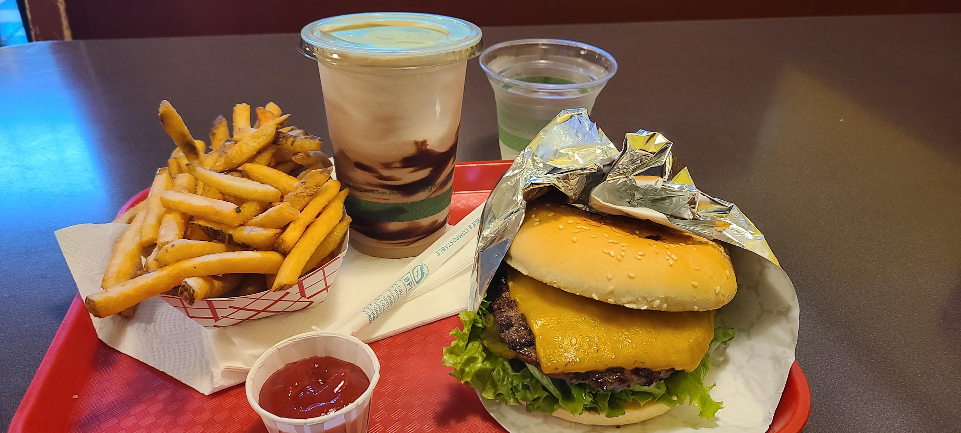 The burger menu is actually rather extensive with all the possible options and combinations, not to mention both chicken and meatless protein is also available. Aside from the burgers (and fried mushrooms), there are mounds of fries or Onion rings to choose from. There are 20+ milkshake flavours to choose from plus malts if desired along with the standard soft drink array along with Ice Tea and Lemonade. The place can get busy, but the wait is minimal and well worth it. Remember all ordering is online but the site is super simple to navigate and...