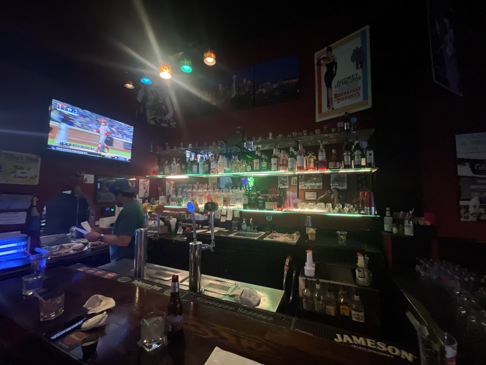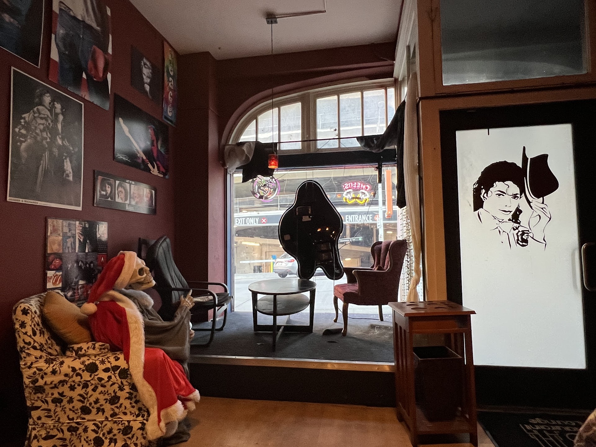 Basic bar, plain wood tables, maroon walls with old rock posters, a skeleton in a Santa suit…you know, your usual dive bar motif.