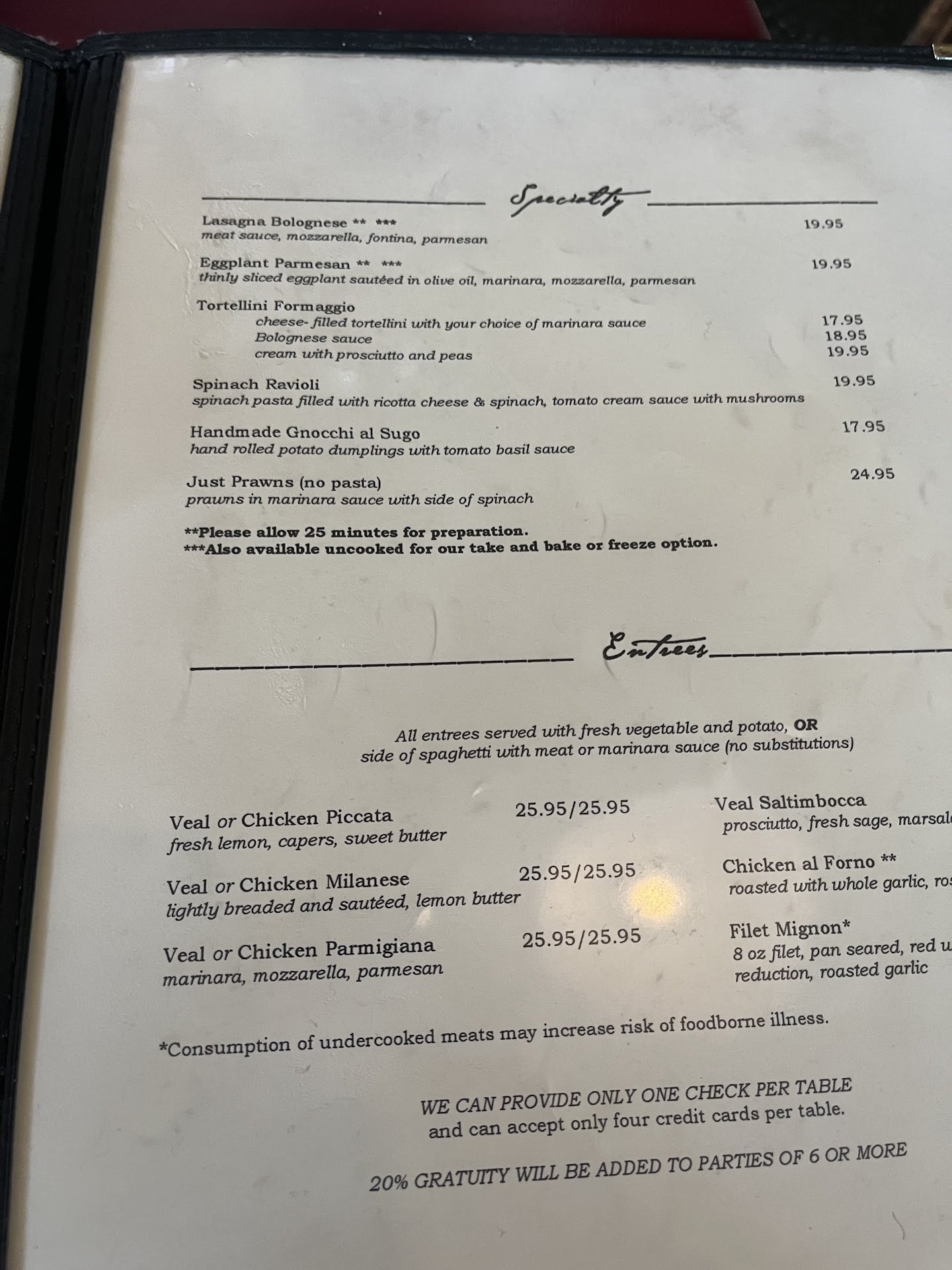 The customer service, however, was honestly a 0/10. First, we got there at 7:45 and were told it was about a 30 minute wait, no big deal! But, we were then told to “be back by 8:15” which made us feel like we couldn’t wait inside the restaurant and we needed to leave.(Their system is very antiquated and all they do is write your name on a paper.) So we walked 5 minutes down the street and got a drink and waited. We arrived back at 8:15 and were told we were second on the list of “twos” to be seated. We were also informed that since we left they just go down the list and give the table away. We would have stayed if the hostess didn’t make us feel like we had to leave and come back at the designated time. We assumed they had a better system to keep up with tables.