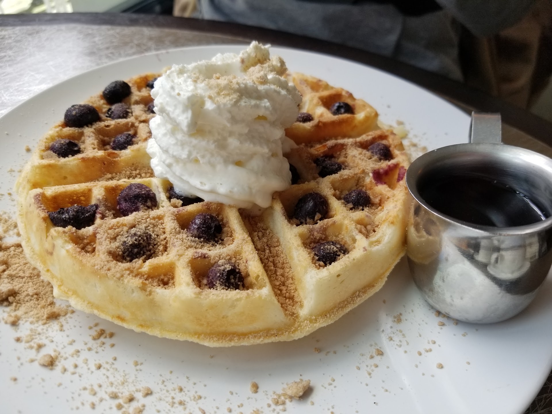Waffles were amazing, counter service was cold. The two of us got a Washington waffle and a cobbler waffle, I'd definitely recommend either. The Apple butter on the Washington was a perfect balance with the melted cheese and pancetta, it tasted homemade. The cobbler was everything you'd want in a sweet waffle. Our lattes were also great, I had a lavender honey latte. The woman behind the counter seemed peeved to be taking our order and acted as though we were inconveniencing her as well as talking down to my friend as she was explaining something, her inflection just seemed demeaning like she was talking to a child. I then watched her wave a finger back in fourth in another customer's face and roll her eyes at another, so at least it wasn't special treatment for just me and my friend. The woman who made and brought us our waffles seemed incredibly kind and thoughtful so at least the food is made with love lol. All in all, I would consider going back to try more of the menu because the food was...