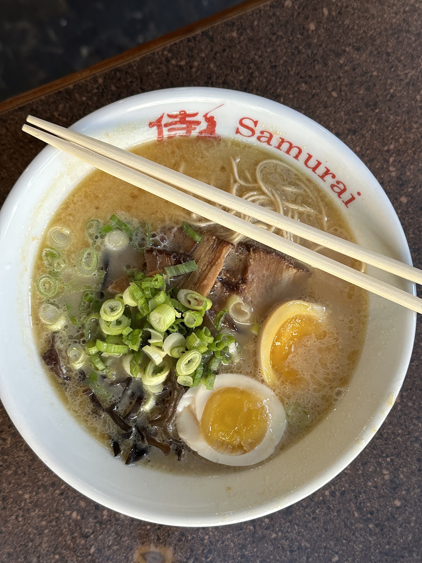 The itamae makes each experience welcoming as the ramen, though the tiny kitchen forces shortcuts that could elevate an otherwise awesome bowl. Their gyoza are the best around. The Spicy Miso Ramen is good to the last drop, making me want to battle a second bowl each time…. but the quest for the perfect bowl continues. Samurai...