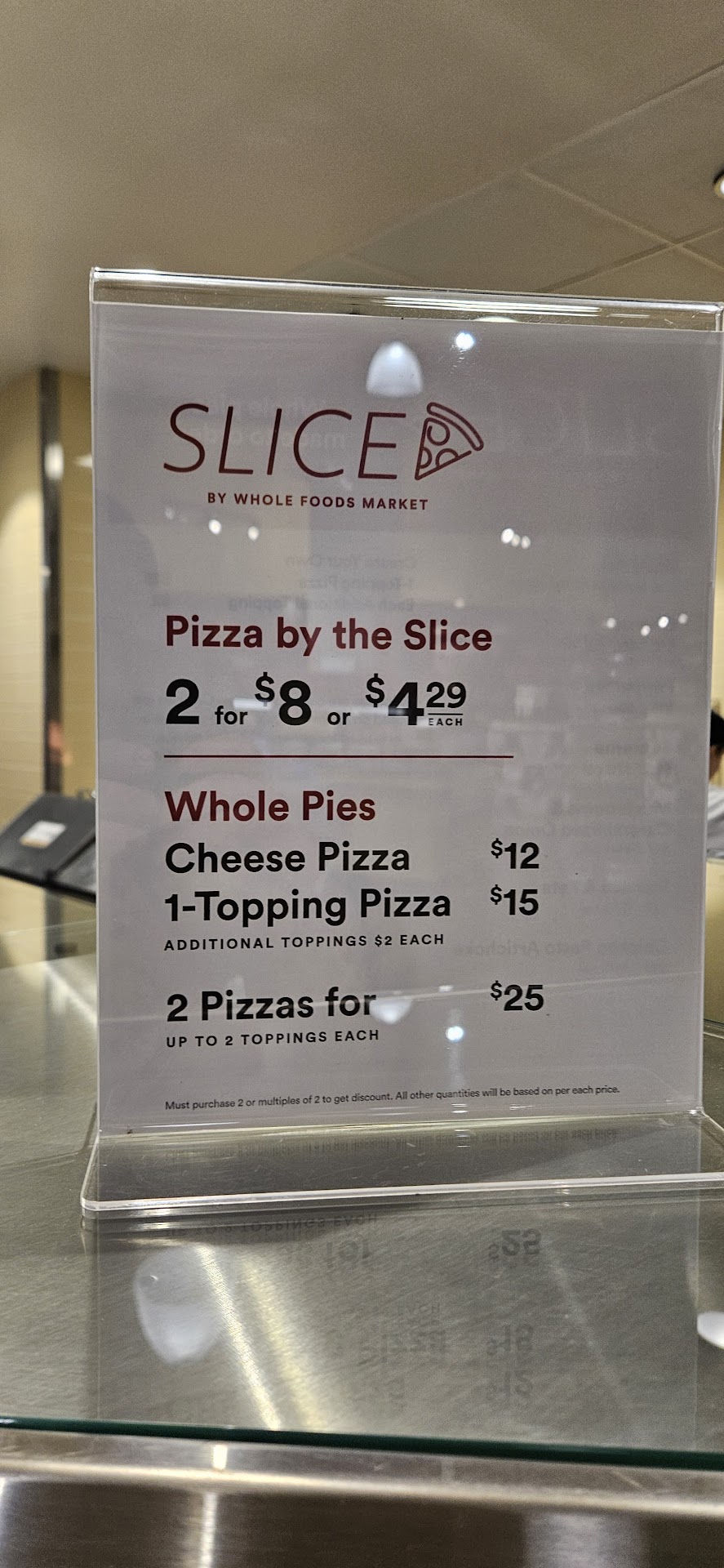 Whole Foods: $4.29 or two for $8 Post Alley Pizza: $5-$5.50 Numero Uno: $4.75 or two for $7.96 Hot Mama's: $4.20 Dino's: -cheese $5.50 round $6.50 square -pep $6.50 round $7.50 square -special $7.00 round (mine had guanciale and asparagus) Zeeks: $4.00 Slice Box: $3.75-$4.50 (secretly the best slices in the city)