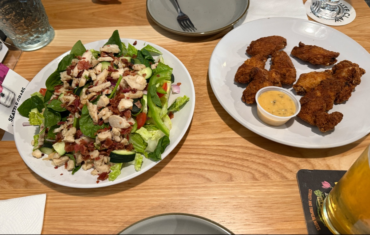 Most of the food had poor quality considering the higher price point compared to other pizza joints. I was looking for artisanal pizza quality but was left with an experience even less satisfactory than a nearby fast-food pizza chain. The pizza dough was tough, rigid and tasted at equivalent or lower quality than Domino's for 3x the price. The Garlic Parmesan wings were very salty (even though we had put the Garlic Parmesan sauce on the side), tasted like they were bought from a nearby grocery store, and were burnt. The sauce for the Chef salad was pre-purchased. Finally, the Pilsner tasted flat even though the restaurant was advertised as a bar.