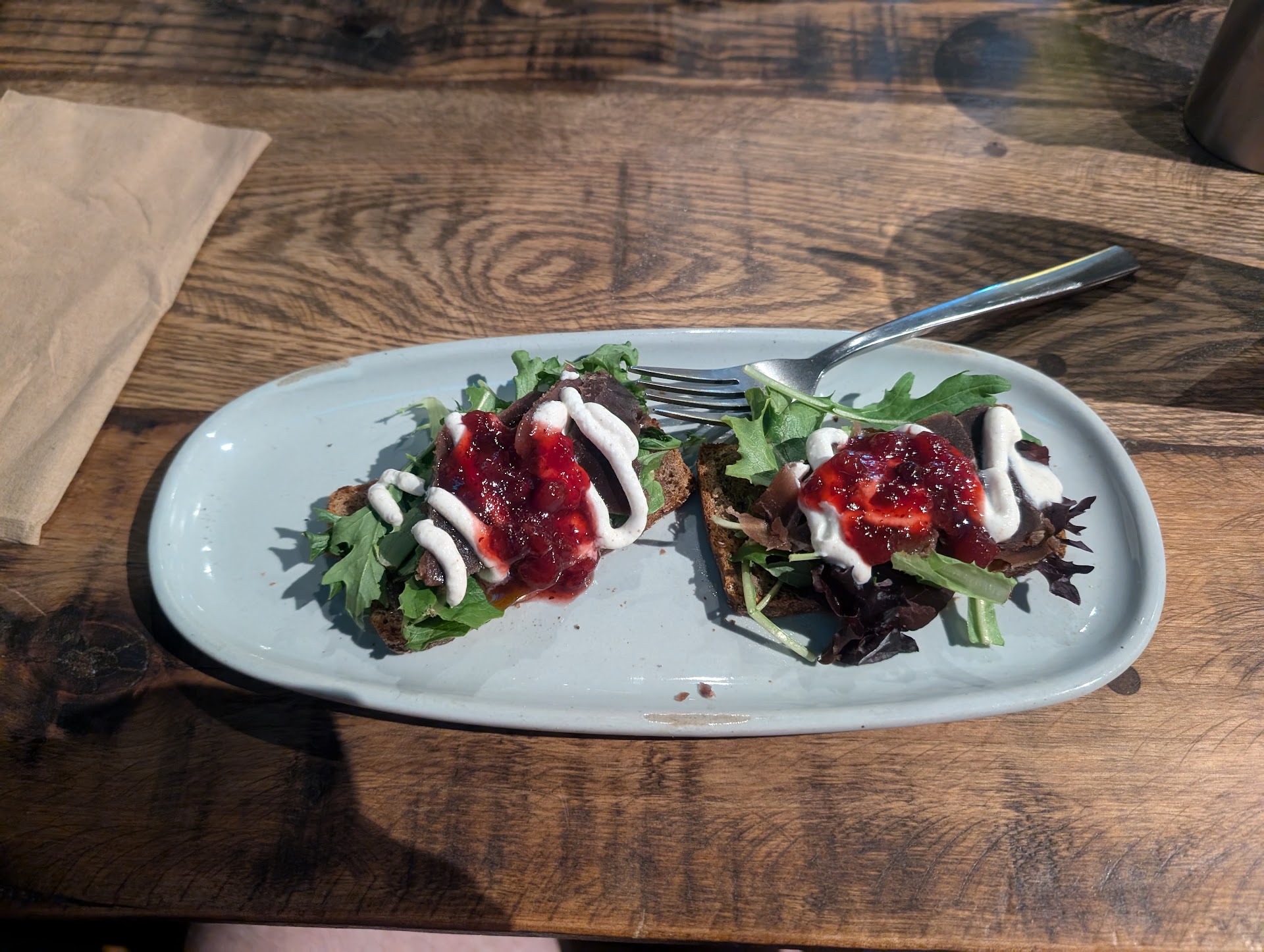 So, the food. They were sort of demo-ing their menu, showing off primarily small and fast offerings, so depending on what their full menu is, you may have a more realistic wait than the 5-10 minutes we had. There were a variety of meat kabobs, standards like beef and salmon to less common options like lamb and venison. Vegetarians fret not, however, as there were a number of meatless choices too. In addition to kabobs, there were "potted-cheeses", which were basically luxurious spreadable cheeses served with a choice of bread (like potato, or pretzel for example). A charcuterie board was offered as well, I didn't end up choosing that, but others did and it looked dope. At the bottom was an assortment of other tasty treats, but by the time I got there I was a few drinks in, so I only remember what I ordered, a "Nordic egg". It was a Nordic take on a Scotch egg, and came with your choice of mustard (I can tell you the lingonberry mustard just elevates the whole thing to another level).