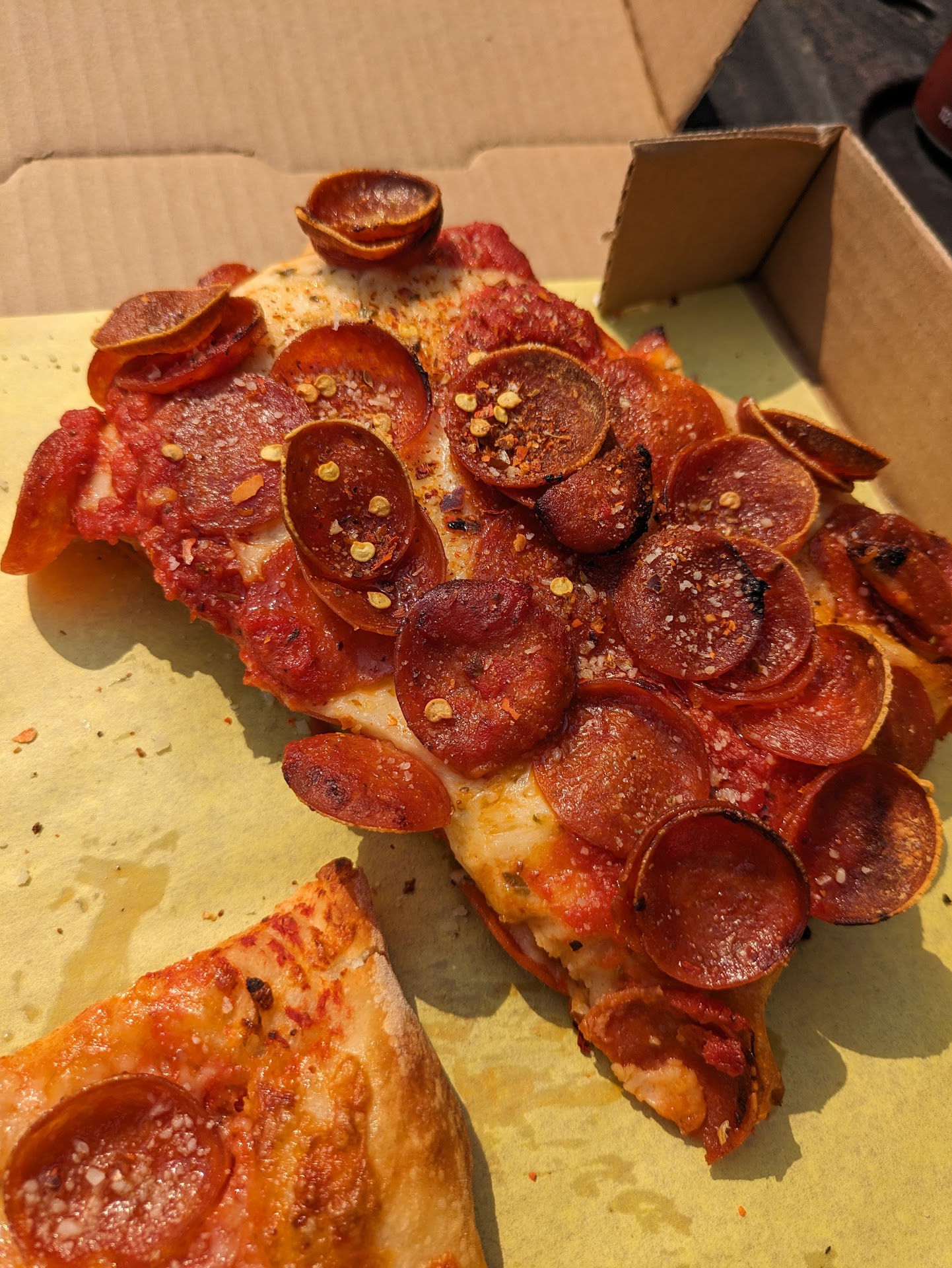 Read moreDelicious pizza! I tried a slice of the pepperoni Sicilian and a slice of their Pepperoni New York. I really liked that they heated my slices " on the bricks" inside the oven. It made the pepperoni nice and crispy on the edges. The Sicilian was very much like a Detroit pizza but better. It had a light crust with lots of nooks and cranies.It had a nice crunch yet was soft and doughy on the inside. The sauce on both pizza slices was spot on. I am sure they use quality ingredients. I would have liked to see a few more pepperoni slices on the pizza but have to give props to the way they cup and get crispy. Perfect under carriage/ leoparding on the bottom...