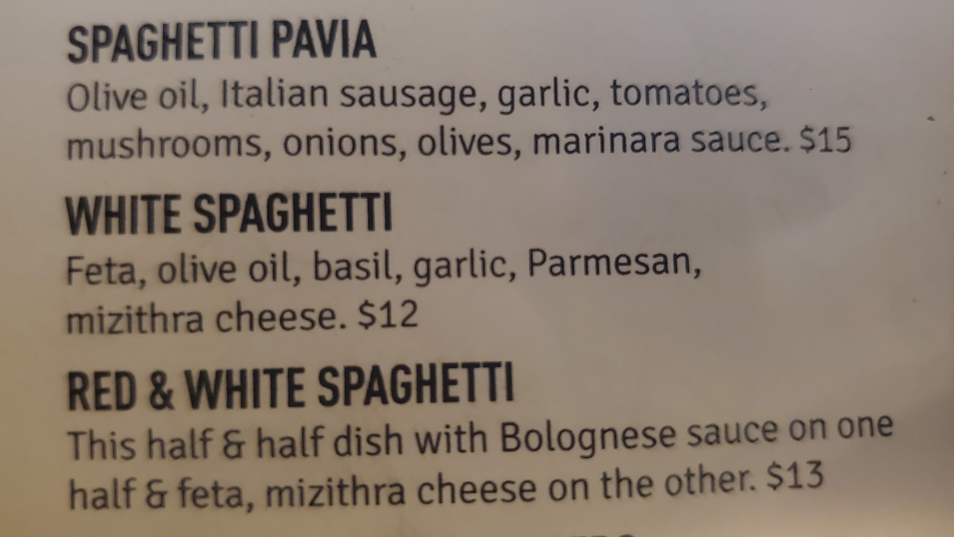 I would normally give them a four to five star review but am disappointed that they would tell me that that's how they make it now and it clearly is not what I ordered from the menu. It was missing 4 out of the 7 total ingredients in the dish. They reluctantly and rudely with sighs gave me a credit for the dish but we will see the next time I order. SO FYI ACCORDING TO STAFF AND THE CHEF: IF YOU ORDER THE WHITE SPAGHETTI THEY DO NOT PREPARE IT WITH THOSE INGREDIANTS AS STATED ON THE MENU. IT ONLY COMES WITH SPAGHETTI, MIZITHRA CHEESE...