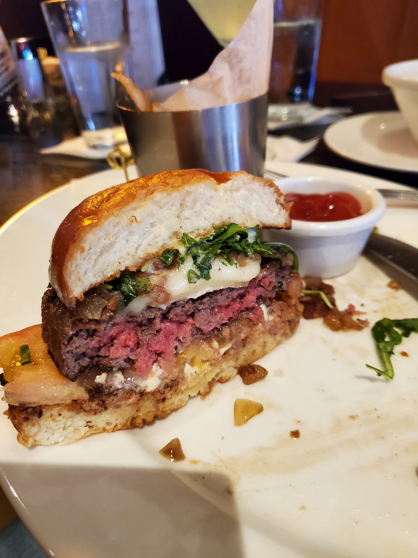 Cheeseburger. It was good. The fries were good. The portion looked small for the price, but it all got eaten and I was full, so that's fine, too. I wasn't a fan of the presentation/assembly of the burger, in particular the iceberg lettuce was an orphan of the wedge salad, laid flat and stacked. It made it a tiny bit tougher on the tooth and ended up doing nothing for the burger, flavor wise. The patty of beef itself was very good, top notch. I really hope it is ground in house as a by-product of their wonderful steaks.