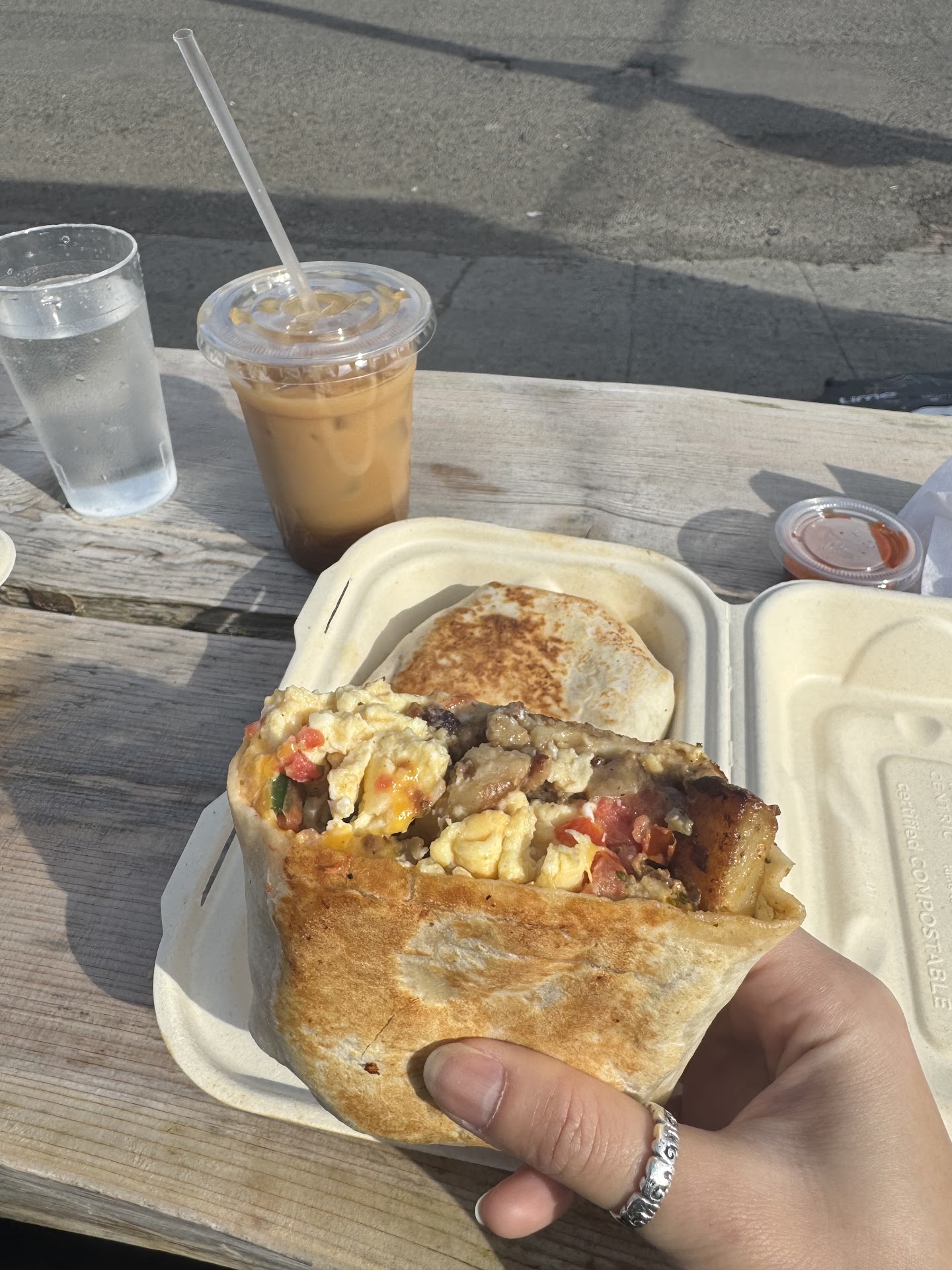 My friend and I each ordered the sausage breakfast burrito, a side of potatoes, a matcha oat milk latte, and their special coconut cold brew. The burritos were generously sized and packed with flavor. We didn't realize they already came with potatoes inside, so the extra side of potatoes ended up being a bit much which was good to know for next time. Towards the end, my burrito was pretty oily but that makes sense since it was sausage. Both drinks were solid, but nothing to write home about.