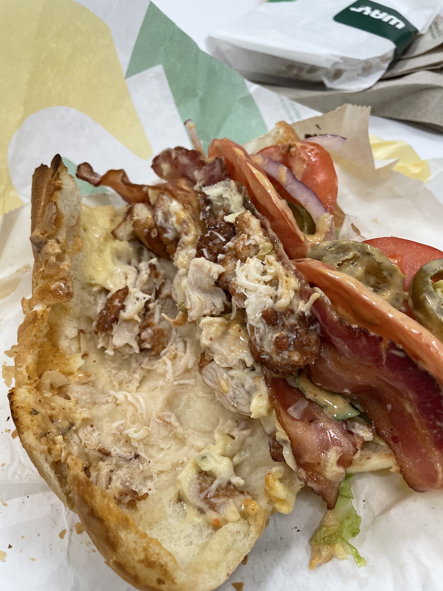 When I got to work, I rewrapped it myself because one half is for lunch, and the other for breakfast. The bread was stale and flaking off, the toppings were stingy. There was NO mayo, salt or pepper.