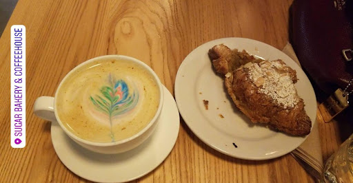 So I came to this coffee shop looking to try the famous PowderPuff latte also known as the rainbow latte and it was honestly over hyped up from all the Instagram pics. When I arrived I asked the barista what was in the latte and she said it was a mix of spices like cardamom my favorite, coffee and milk so I was excited! The latte took a little awhile to come out and they served it to our table and it was lukewarm and not hot which totally ruins the flavor of coffee, well at least for me. The flavor of the coffee itself was totally drowned in the sweetness of the syrup and spices they had added and I couldn't taste the coffee at all but the pretty design in rainbow colors at the top of the foam was nice. This was the first time I couldn't finish a cup of coffee since it was way too sweet for my taste. I also ordered an Almond Croissant which was absolutely delicious but very rich and heavy in flavor, probably best to split one. It also had some sort of amazing almond buttery filling inside that was yummy. The staff was very welcoming and knowledge about the coffee and all their bakery goodies. They also had tons of options like cakes by the slice, cookies, macaroons, and more. The seating area is big with the barista and coffee machines in the center but it does tend to get busy with the apartment building right upstairs and all the foot traffic near the Space Needle area.