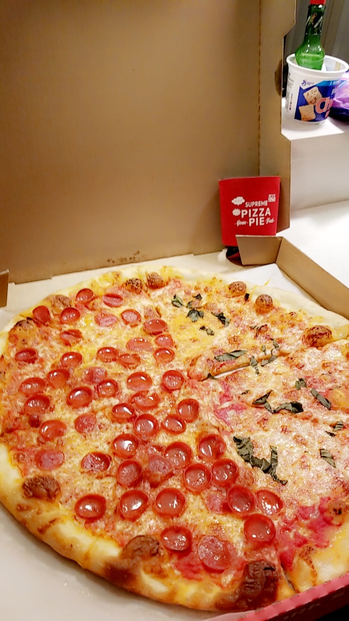 Read moreIn the birthplace of Pagliacci Pizza, in the University District, Supreme settles in. I've been here quite a bit. I like the lounge feel, with the red glass candle holders, and old school pizzeria vibe slash decor. The pie is usually a good bet, with thin chewy NY style crisp crusts, whole or by the slice. The pizza is good. The wings are okay, not great, and to be fair, better than average for baked, but with the Ma'ono relation, I'd expect better. I understand it would be short of absurd to somehow jam a deep fryer in their space, but c'mon with a little gumption, Ma'ono/Sunset at Supreme could be accomplished. But with Chi Mac a couple doors down, why bother, amirite? Chi Mac have amazing wings if you don't know.