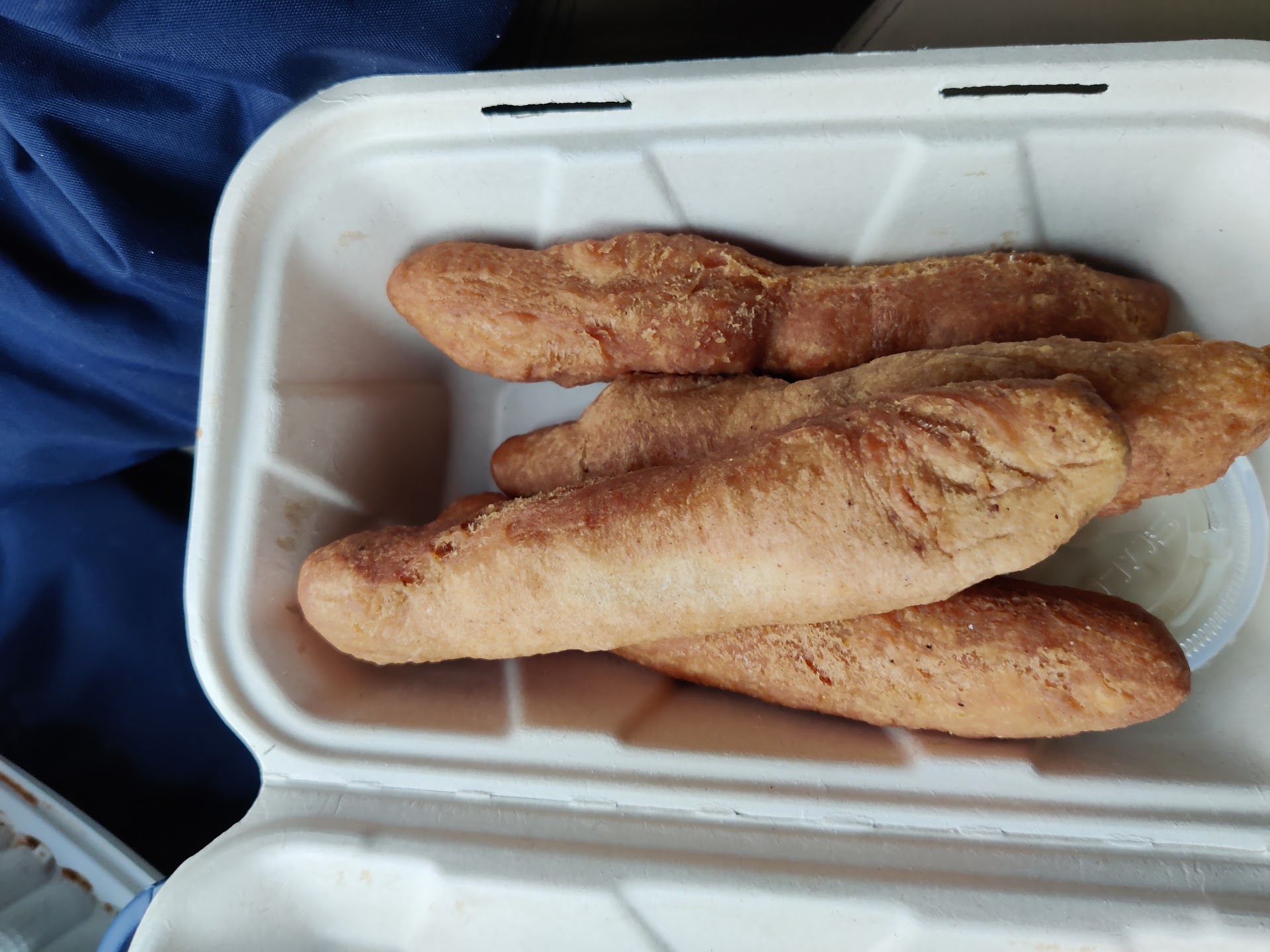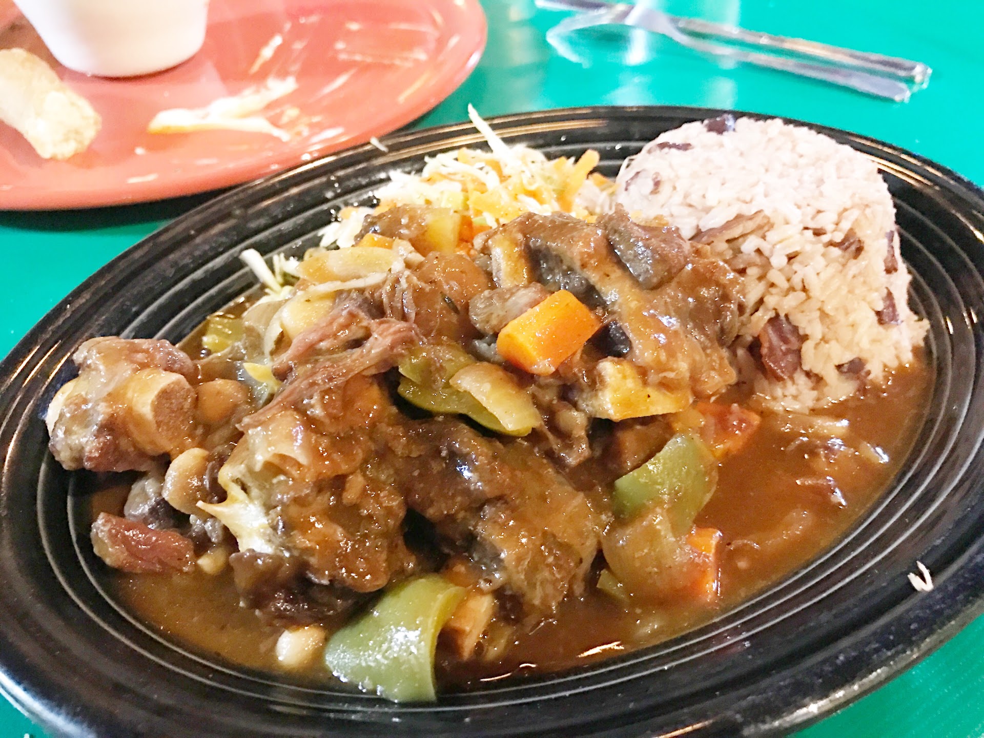 The food was a disappointment. The cod fish fritters were crispy with good consistency, but mostly just breading. I was unable to find any pieces of fish in one of them, and only one very small piece in another. The goat curry was junky meat -- mostly bones and fat, scant actual meat. I expected vibrant flavors and a little spice from a carribean curry, but the seasoning was undersalted and not particularly flavorful or spicy. The jerk chicken was a little better according to my son. But the chicken was overdone, and the skin was soft, not at all crispy. The rice and peas met our expectations.