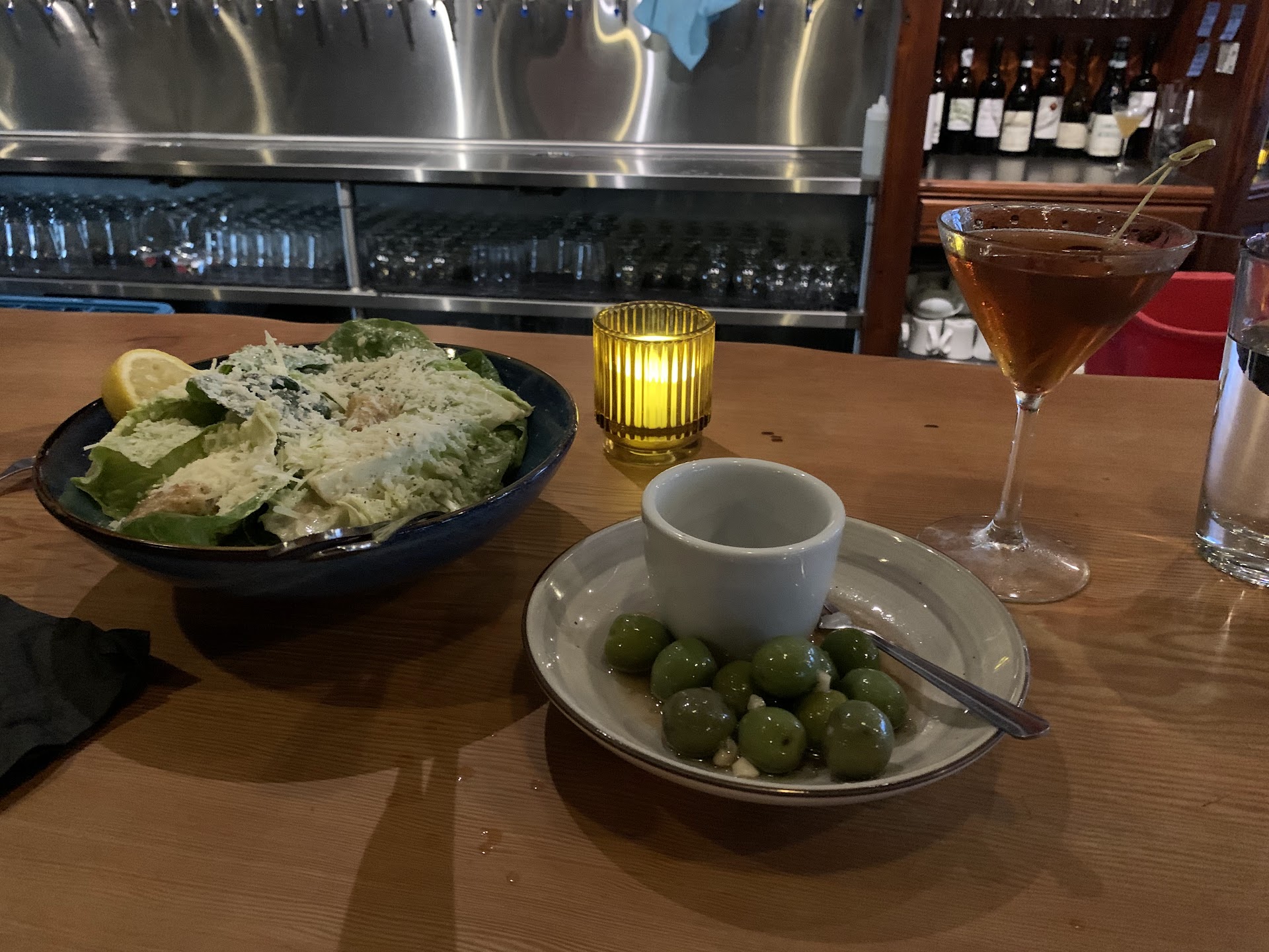 Here are words to describe my experience: toothsome and delectable (food); congenial, personable and efficient (service); neighborly and relaxing (atmosphere); and accessible (value). From the happy hour menu, my husband and I ordered a burger (included a pile of skinny fries), Caesar salad and olives, he sipped a Manhattan. While waiting for our food, for future reference we perused the black board with the impressive variety of steaks. Staff member Sarah shared info on the different cuts and sizes, tempting us to come back with friends for a full feast.