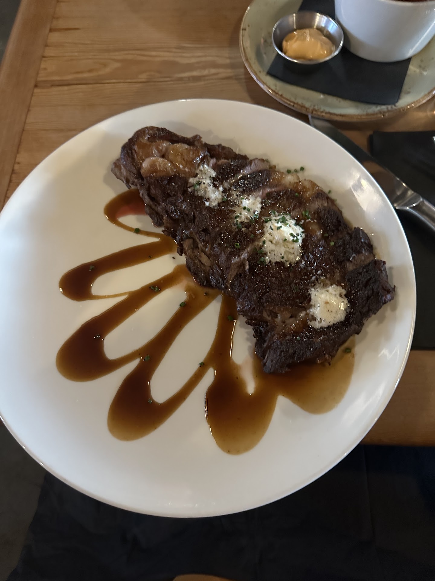 My partner got the pork chop and I got the ribeye. The pork chop had some pink but we ate it anyways because we assumed it’d be fine at a nicer restaurant. The pork chop tasted decent but honestly was kinda dry. The ribeye tasted great (nothing amazing but was definitely above average), but there was a giant clump of fat at the end of the steak that was at least 3oz. I’d have hoped they could’ve trimmed this off (and not included in the weight/price) for an $80 steak.