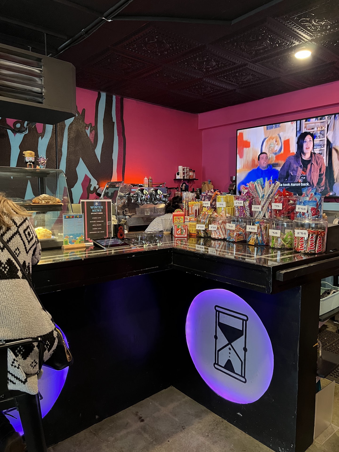 We came here for a date night & it was a lot of fun! Upon first entering, the atmosphere was really cool. It was maybe a bit smaller than I was thinking it would be, but still really nicely laid out. The person working was friendly, when we entered we weren't greeted but there was no one else there & I think they were probably just in a chill mood since it was slow. There were 4 arcade games: Aliens Exterminator, Gauntlet Dark Legacy, Strikers 1945, & Terminator Rise of the Machines (pinball). They also had 4 person Smash Bros set up. Of all the options I would say Gauntlet was my favorite! If you want to play some board games they had a few of those set out as well. The coffee was really good! I had an oatmilk latte. They even made latte art which was a super nice touch & it tasted very smooth. We ended up picking up some candy on the way out just to spend the last of the cash we brought with us. Overall it was a great time & we'll definitely be back! IMPORTANT: Make sure to bring cash if you want to play the arcade games! If you didn't bring any with, you can use the ATM across the street...