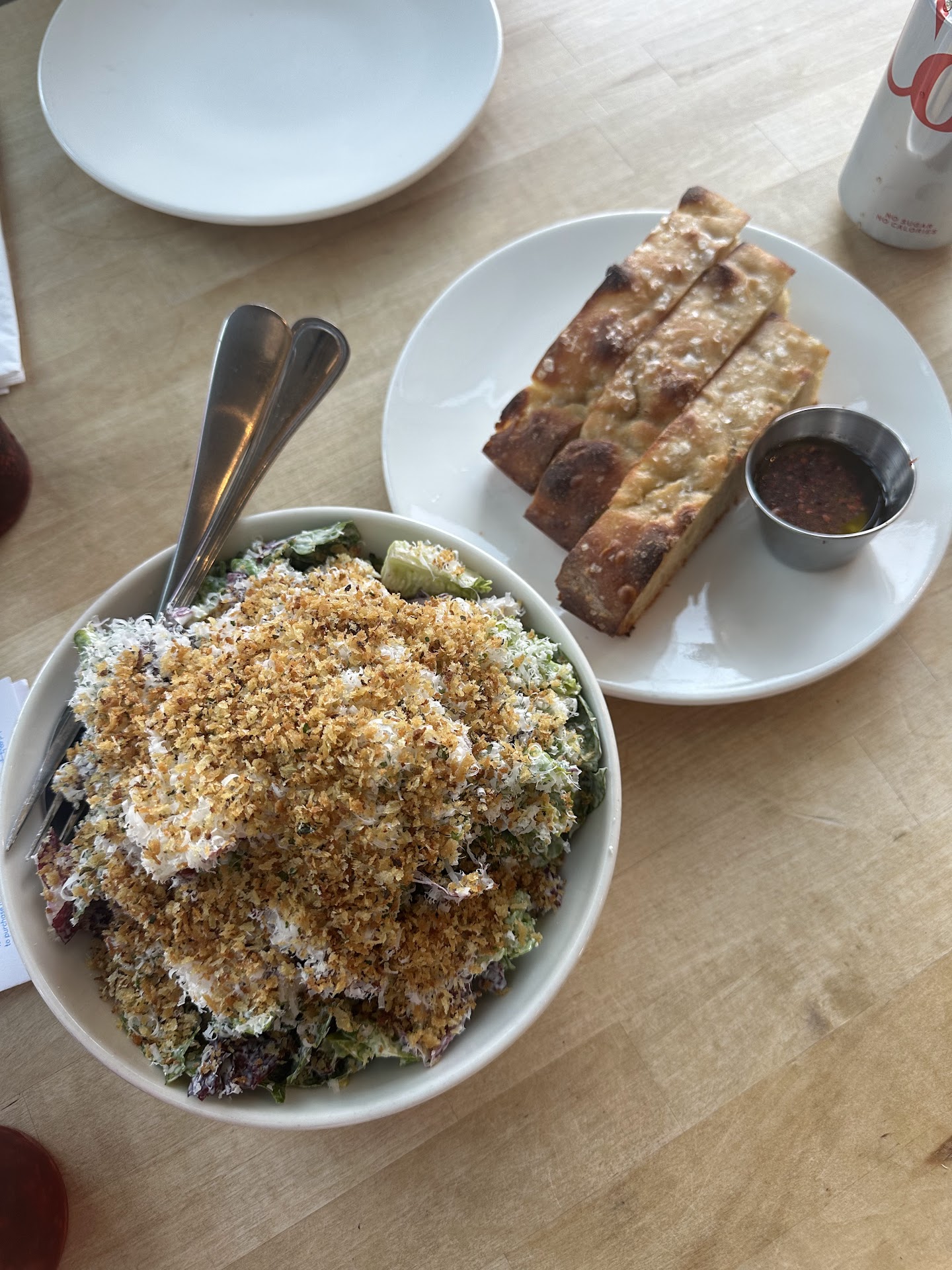 We ordered the ceaser salad which was BOMB, the focaccia with olive oil, which was a hefty portion, and also the veggie pizza. I don’t usually go for vegetarian pizzas but singles we did, because the white sauce and toppings on this one were delishhhh!