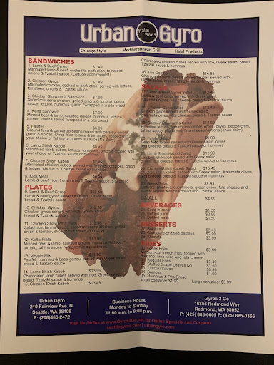 Read moreFirst, our food was good. The falafel gyro was good and my co-diner had the lamb and said it was good as well. They were very large and more than enough for one person. I also had the Greek salad. The salad tasted fine, but I was looking forward to the olives. There were none. It was mostly ice berg lettuce, some red onion and what appeared to be powdered feta. It's the experience that was more odd. It's a small place and we were the only ones there. We were greeted nicely with a great "hello" when we walked in. I proceeded to give the gentleman our order and he appears to be putting it in as he looked at us. Then there was some silence as I waited for the amount. Now all of the sudden he speaks and his no-accent changes to a heavy accent and asked to take our order. Bewildered I give him the whole order again. Then he says "numbers" we have to order by the number. OK, I give him the numbers. He confirms what we want and is wrong. I had to correct him on a couple items as per the numbers on the menu. OK, now the amount. EXPENSIVE! Then he says cash only. We were not prepared to pay cash but gather up the last of our cash to cover the bill with a few dollars to spare. Prepared to drop the change in the tip can, he takes our cash, looks me in the eye, shuts the register drawer and walks away. Never offered to give us change. As we waited, two more customers came in. They ordered and were prepared as they told him they had no cash and he gladly took there credit card. Before we left another person came in and paid with credit card. So, food OK, but very expensive (we're not from Seattle and not used to city prices I guess) experience odd, just be prepared to tell him you...