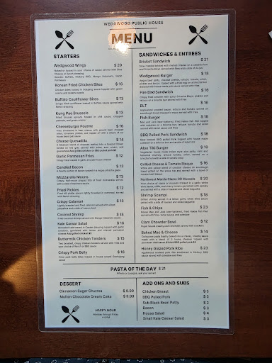 we went there because our son (10y, I know....) wanted to try it out. I like to see new restaurants come up and appreciate how difficult the business is, so I go to new restaurants wanting very much to love the food. This new iteration of the Wedgwood local sports pub is very snazzy, well decorated and boasts excellent and kind service. Unfortunately, the food... The fries are good, but are a bit of a gimmick since they are battered in a cornstarch slurry or some such thing. Pub food done well is, well, sublime. It is simple fare, so it's important to do it right. This is unfortunately, not what's happening in the kitchen. First, mozzarella sticks, obviously dumped into the frier out of a bag, not freshly battered. The accompanying marinara seemed like crushed tomatoes from a can. Chicken tenders (more like cutlets) also out of a bag, very similar battering. Burgers were incinerated, my wife who always asks for well done when they ask, thought it was overcooked. Part of the patty was actually crunchy, it was so cooked. Not seasoned either. The bun was really good, though, fresh and soft. Great job sourcing the buns. Egg was over easy, but the yolk was cooked hard. That defeats the whole purpose of an egg on a pub burger!! You can't overcook the egg. The quesadilla was pretty good, chicken fajita kind of thing, chicken cooked with bell peppers stuffed into the thing, although I'm not sure that the cheese was a Mexican style blend, seemed kind of like mozzarella. So, overall, kind of overpriced bland small-town 1980's level pub fare. Would have been one star if the service weren't so kind and attentive. Gotta up your kitchen game, Wedgwood Public House! The ambiance and location...