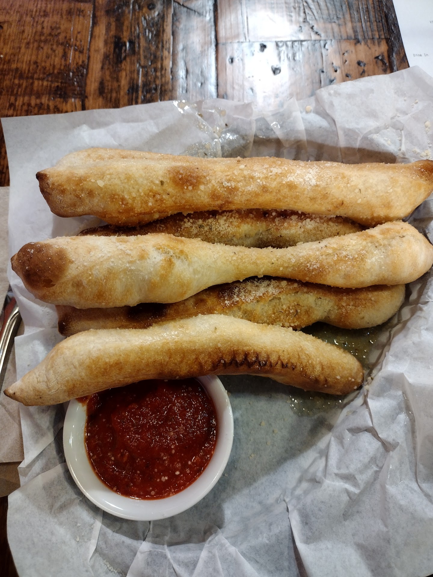 Two, deep dish takes approximately 45 minutes to cook so, if you're hungry, you're going to have to order one of their high-priced appetizers. I had the bread sticks. Tasty, but I didn't care for the marinara dipping sauce that came with it.